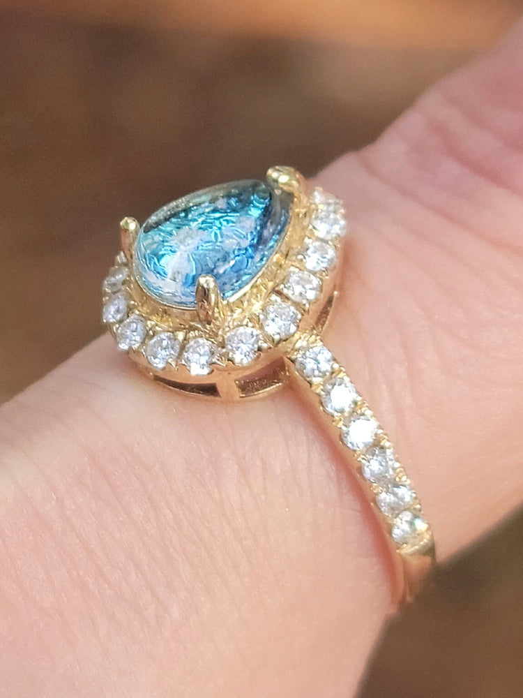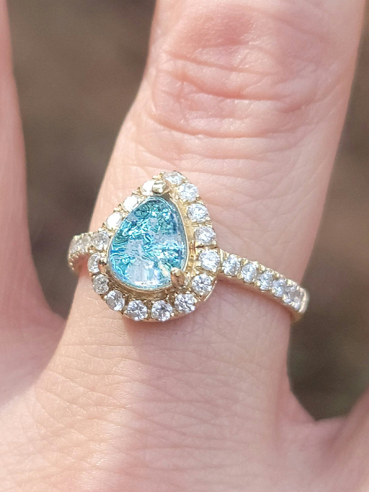 - Materials: 14k gold, Moissianite or Natural Diamonds Ash Infused Glass