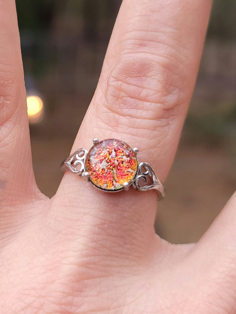 The Love Heart Cremation Ring is crafted with profound spiritual meaning. The enchanting hues of the glass, which alter from yellow to yellow orange on the exterior to pink on the interior represents the soul’s transcendence.
