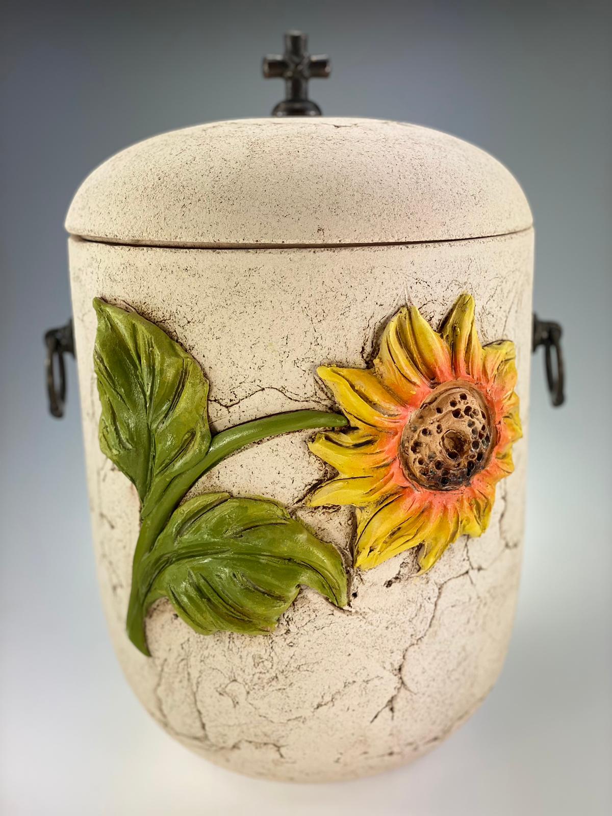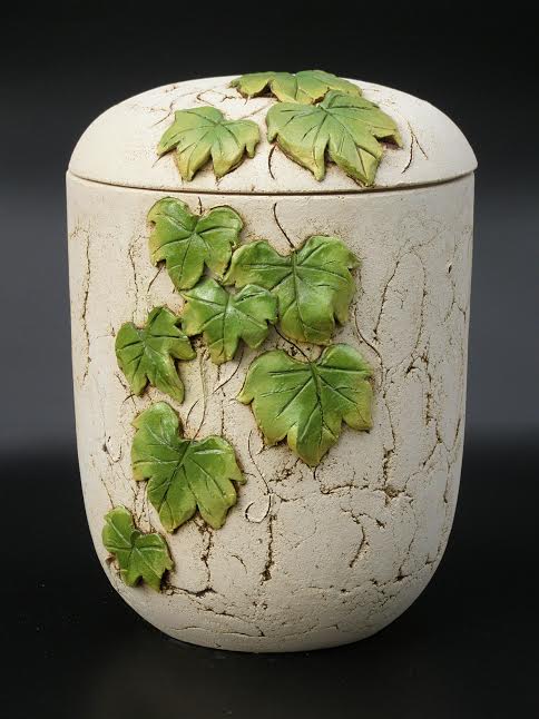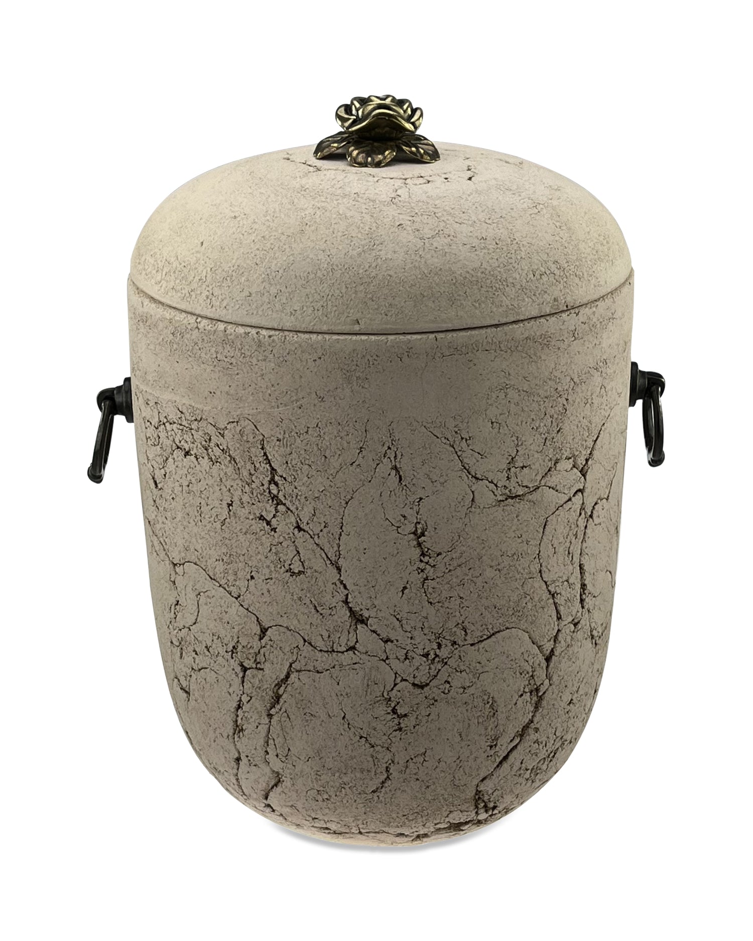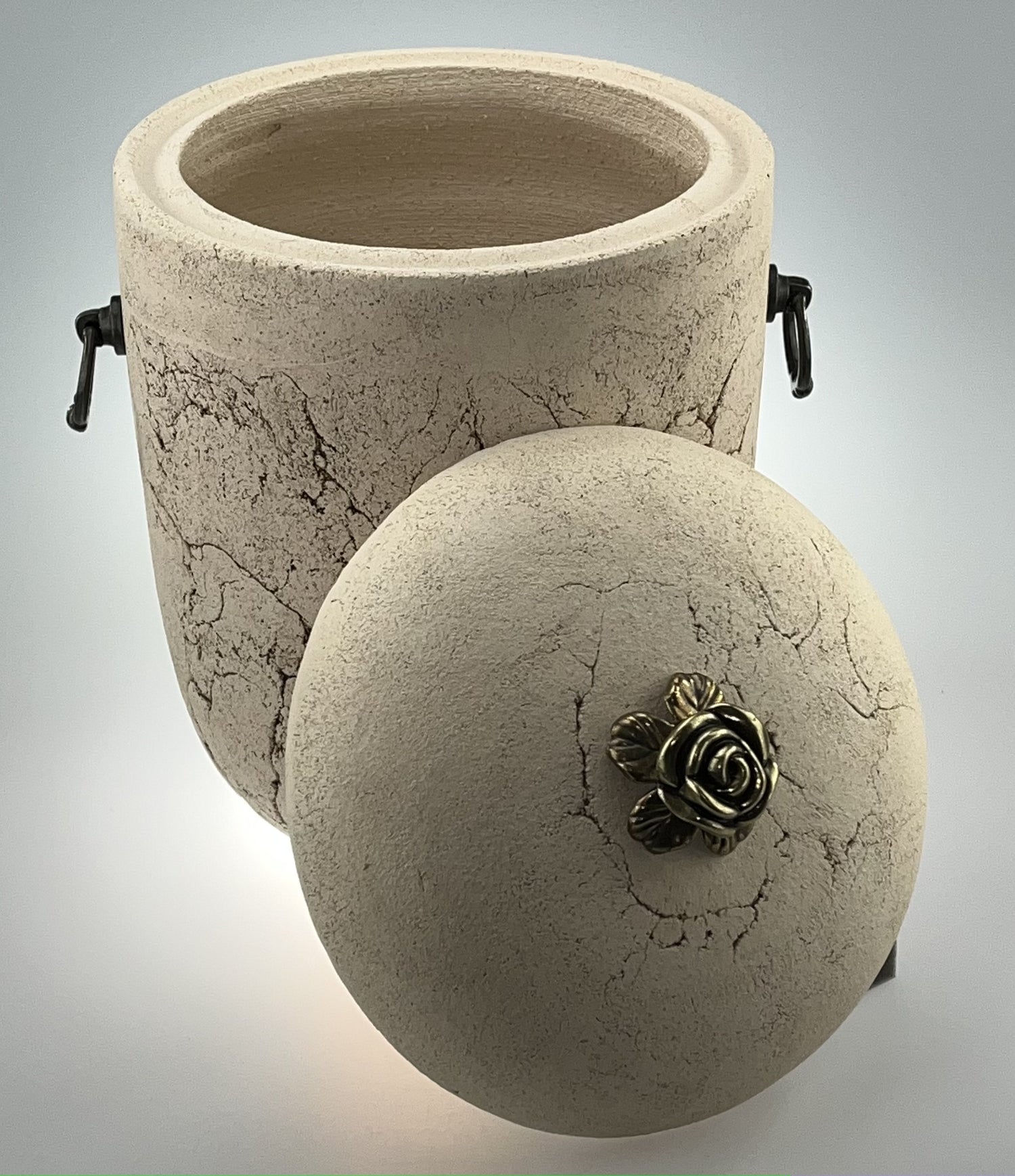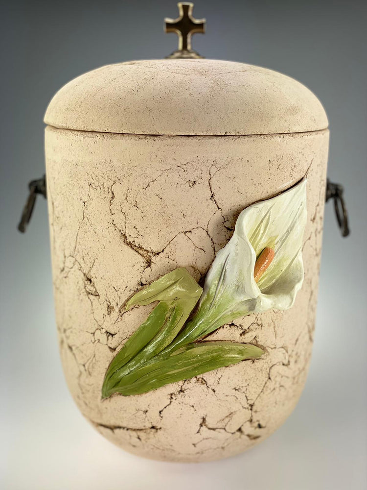 The handmade fireclay urn is truly beautiful and inimitable. The design is inspired by the traditional form of proto-Slavic urns and reminds you of lava rock. The unique composition of the cracks are obtained through firing at excessive heat of 1200 degrees Celsius. The natural hue originates from ceramic that comes from domestic mine seams and each item is specially made from scratch by hand. Apart from the basic model, you can also choose from various other patterns that feature handcrafted floral adornments.