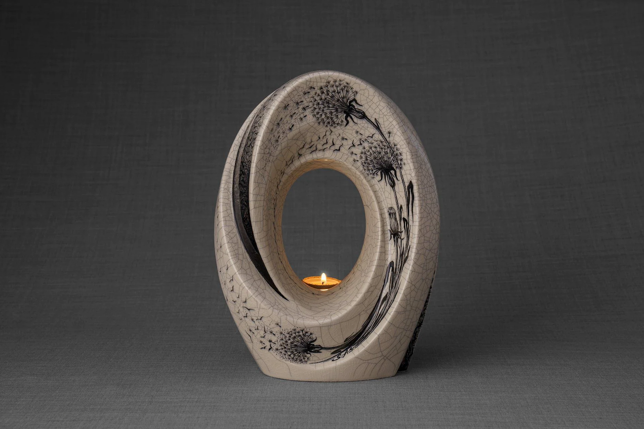 The Majestic Birds Luxury Ceramic Urn, part of "The Passage" collection, is a splendid tribute to your beloved. Hand-decorated by skilled artists, this urn serves as the perfect memorial keepsake to honor and preserve the memory of your loved one. The design captures the beauty of dandelions blowing in the wind and transforming into birds, symbolizing the cycle of life and the freedom of the soul.