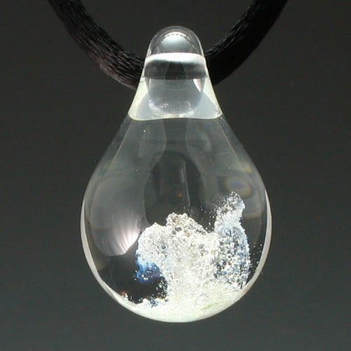 The Nimbus Crystal Pendant is a deeply emotional and spiritual keepsake. Each teardrop is handcrafted by a skilled North American Blown Glass Artist, encapsulating a small amount of your loved one's ashes.