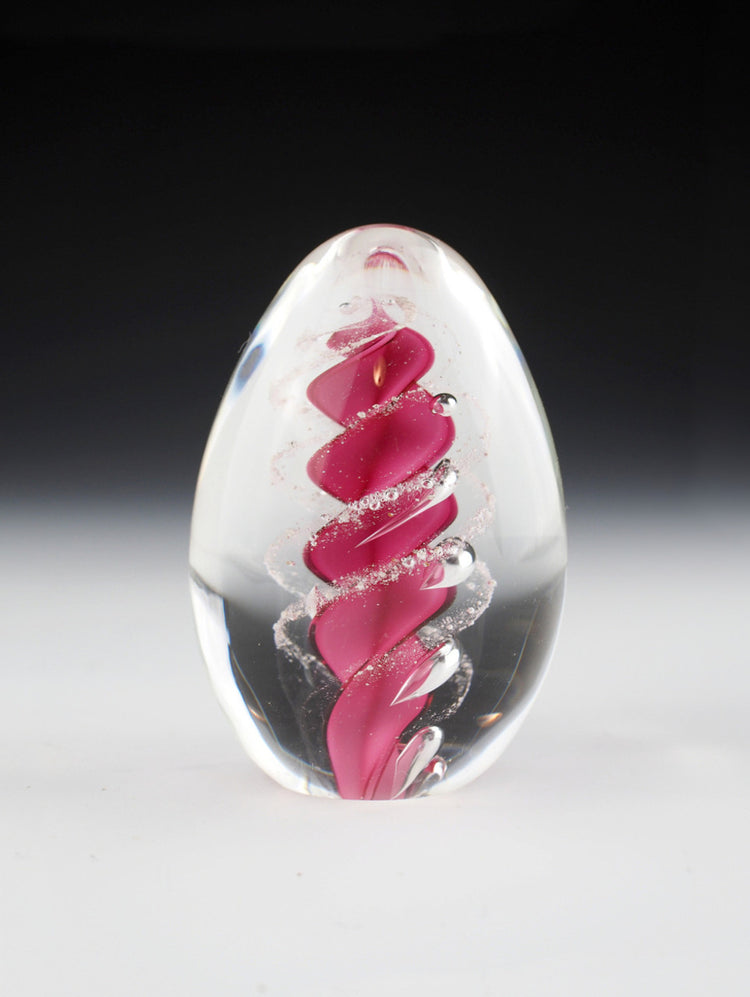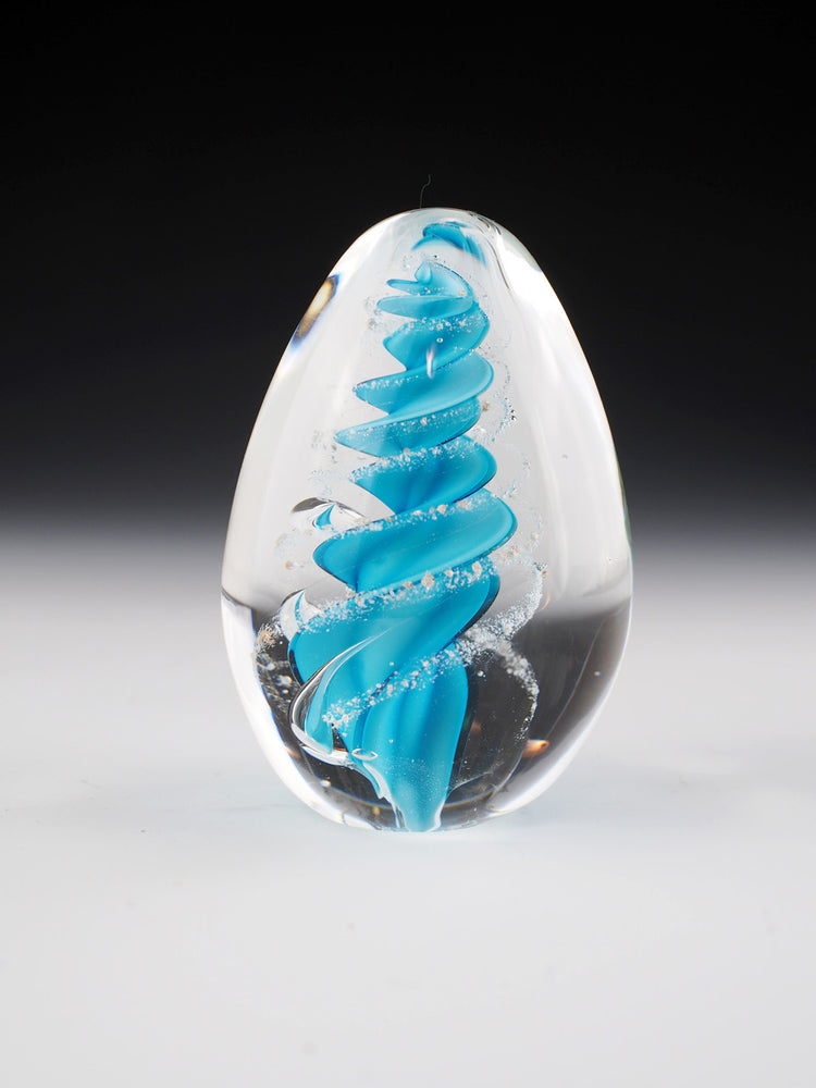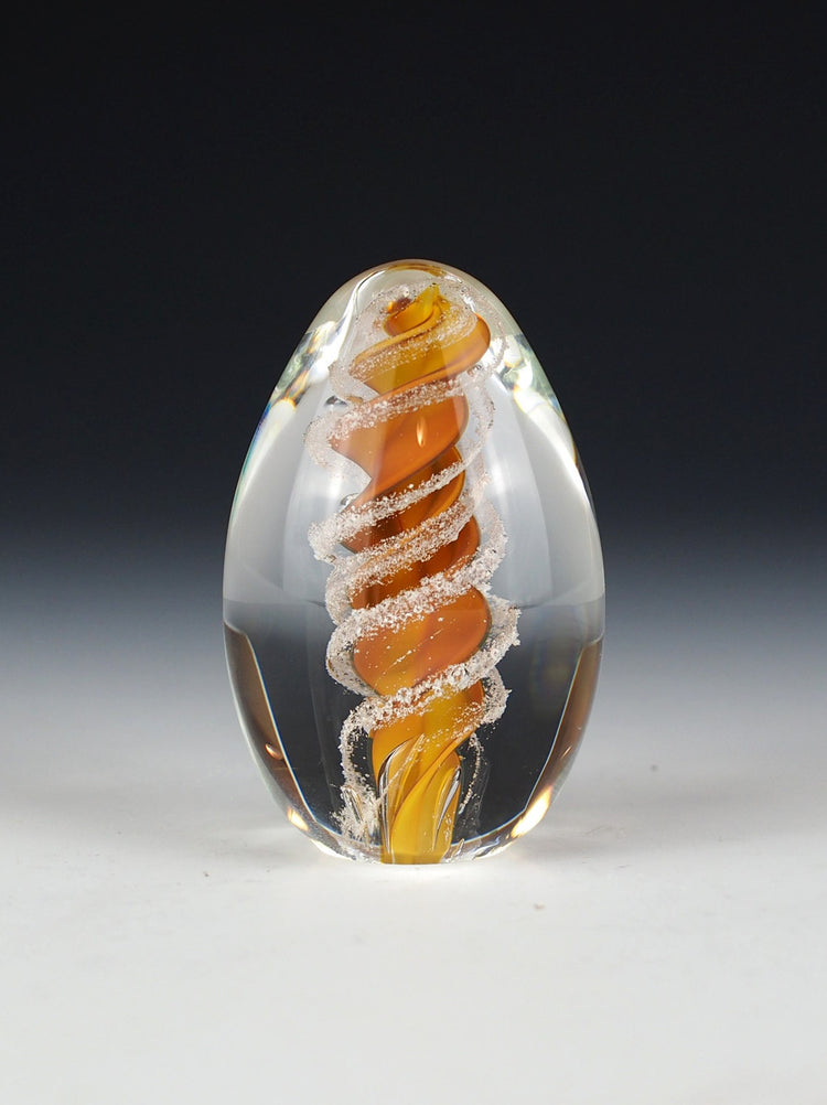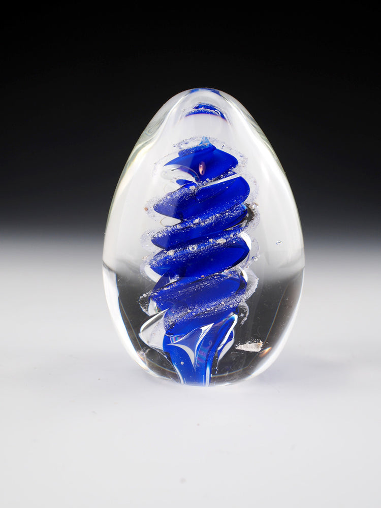 The Tranquil Oval Memorial Paperweight features a center color swirl with a spiral of cremains, all encased in a solid clear glass oval. Standing at approximately 2.5" in height, it requires only a 1/4 teaspoon of ash.