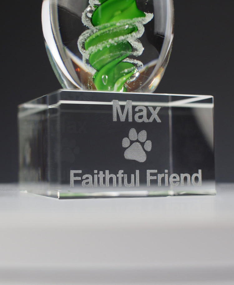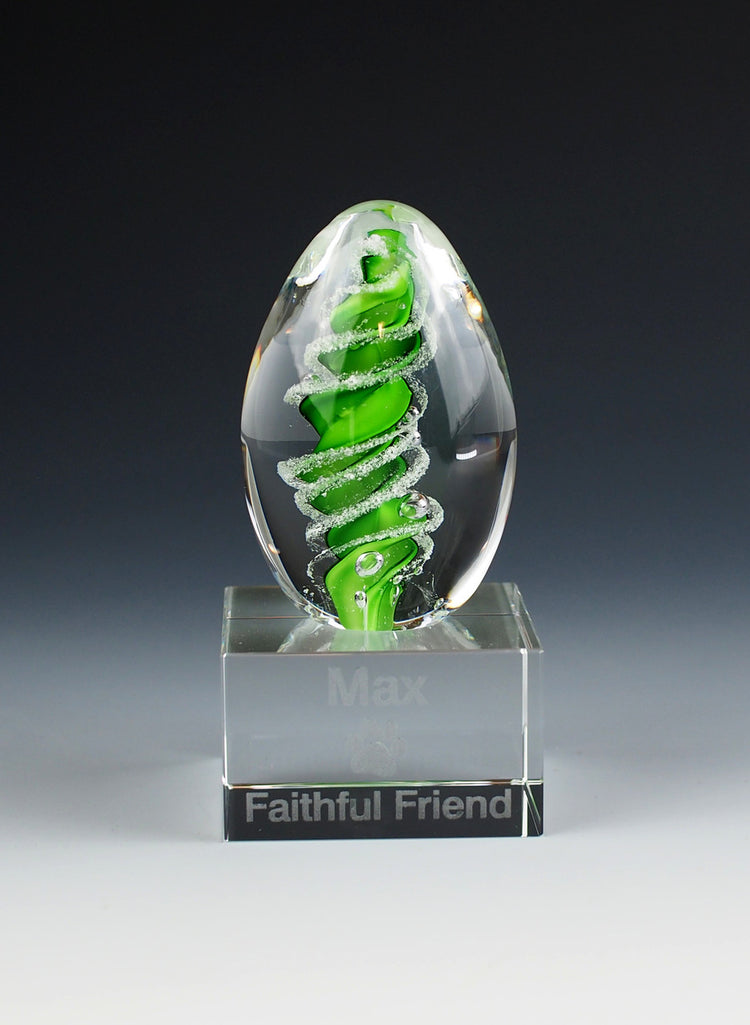 Crafted from molten glass, this memorial brings a sense of peace and continuity to any space. Optional engraved bases and handwritten inscriptions offer a personalized touch.