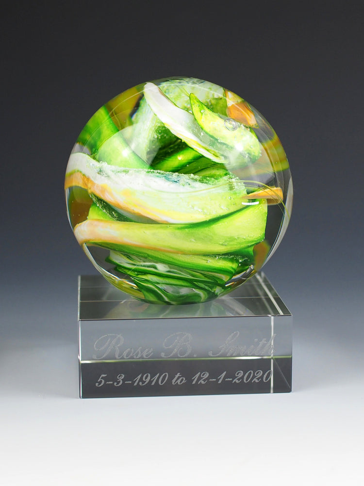 Crafted from molten glass, it's both a memorial and a piece of art. Personalize it further with an optional engraved base and handwritten inscription.
