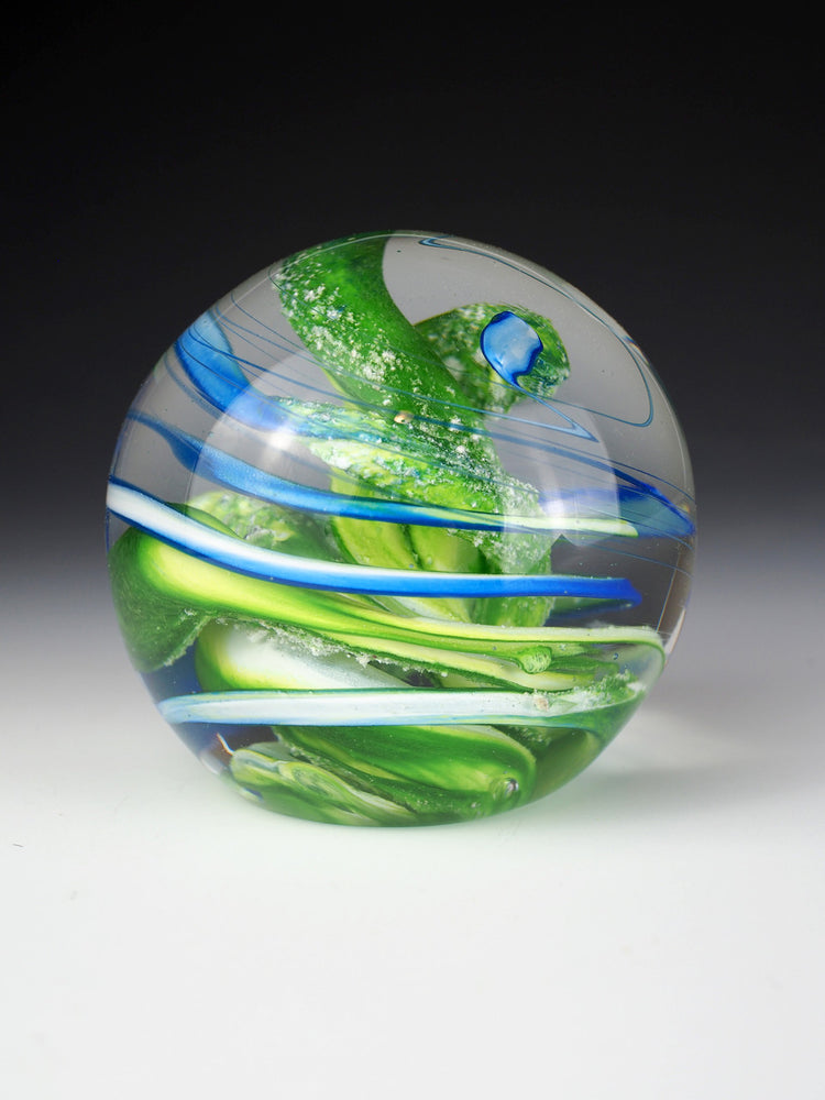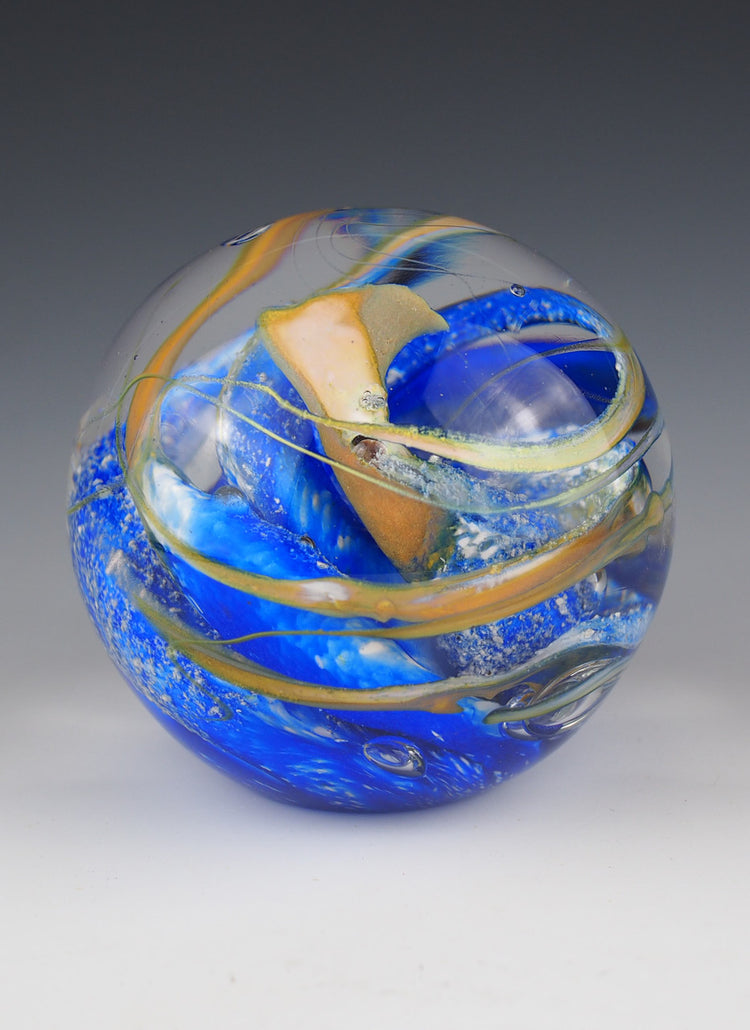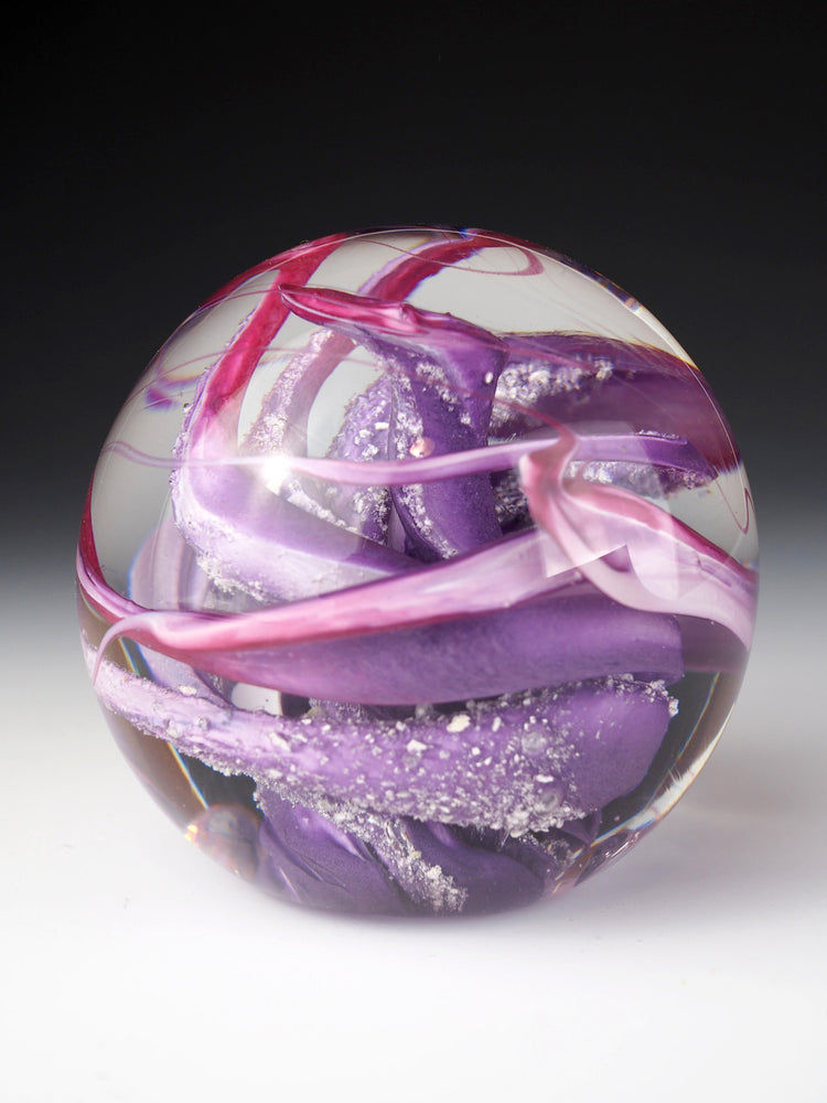 The Zenith Swirl Ashes Memorial Orb features a kelp-like swirl of color, encapsulating your loved one's ashes in a clear glass sphere. This orb is a unique and artistic way to pay tribute, available in two sizes and requiring only a 1/4 teaspoon of ash.