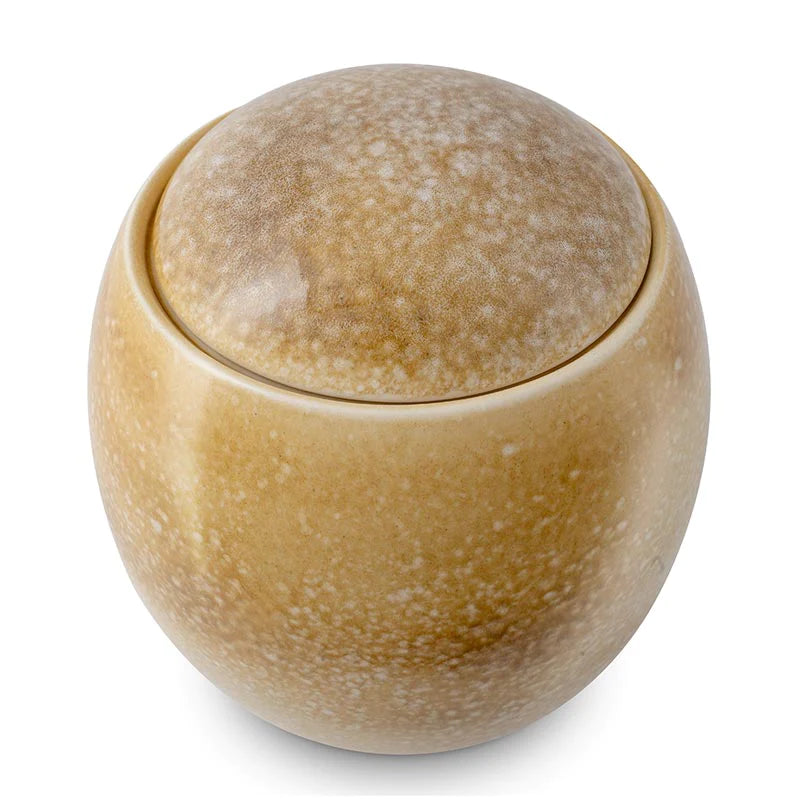 The amber modern cremation urn is specially crafted with a rounded shape and tapered appearance at the top and base. The glossy glaze gives it a smooth feel and aesthetically pleasing appearance. The name represents an amber gemstone that signifies the courage you have during the grieving period after losing a loved one. The sandy and light amber tones in combination with the textural detailing and soft surface gradient reminds us of sand dunes. The beautiful tones and overall look make it a beautiful decorative piece to match your existing décor. Honor the memory of someone who has passed on with this stunning urn that can be used indoors and outdoors.