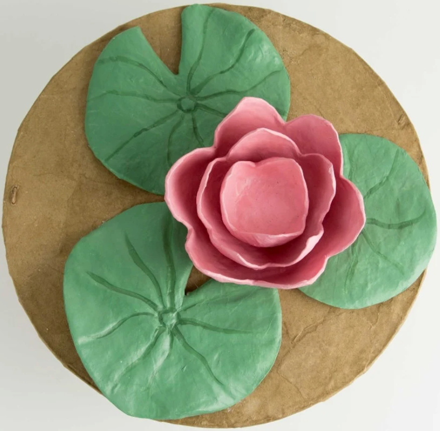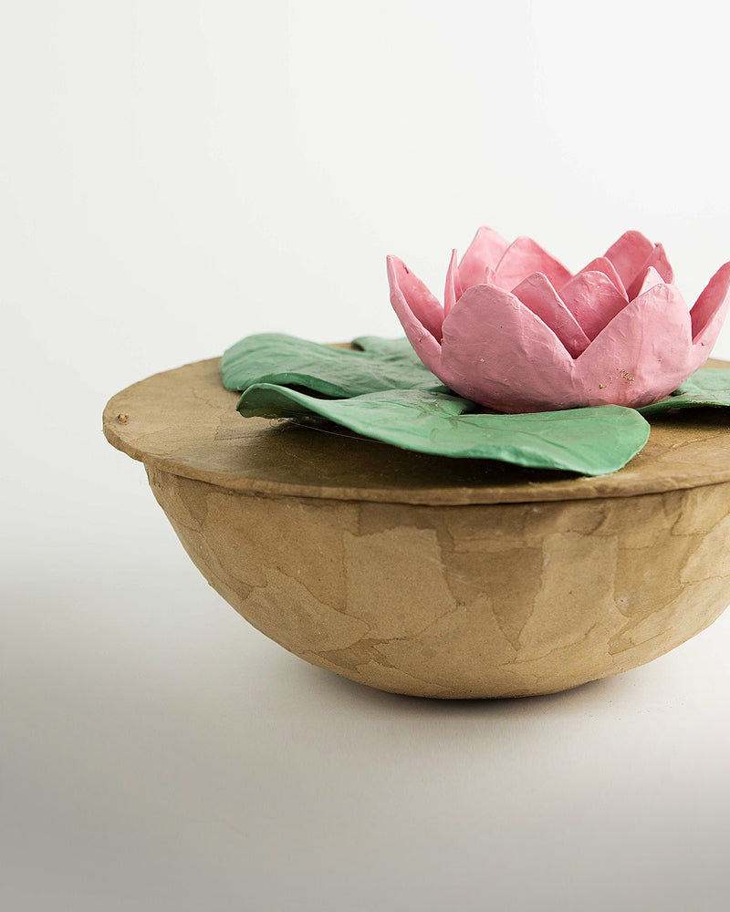The urn is made from 100% biodegradable materials and will naturally disintegrate over time. An exquisite hand-painted Lotus flower adorns the lid that rests on the base. Two leather cords keep the lid in place with no glue required.