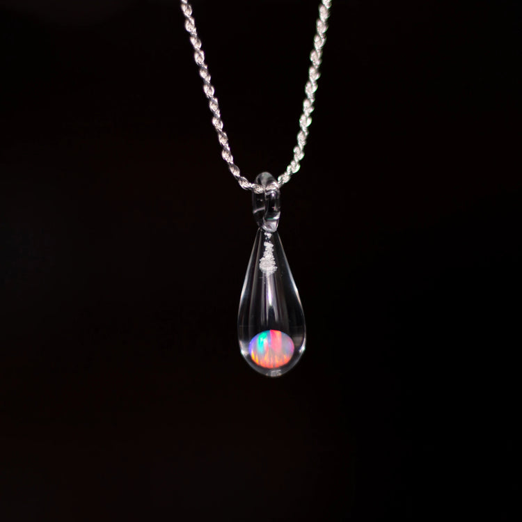 This gorgeous teardrop glass pendant has a striking opal that flashes different colors when held against the light. The photo doesn’t truly capture the beauty of this unique keepsake. A tiny bit of ashes is infused to celebrate the life of someone you’ve lost.