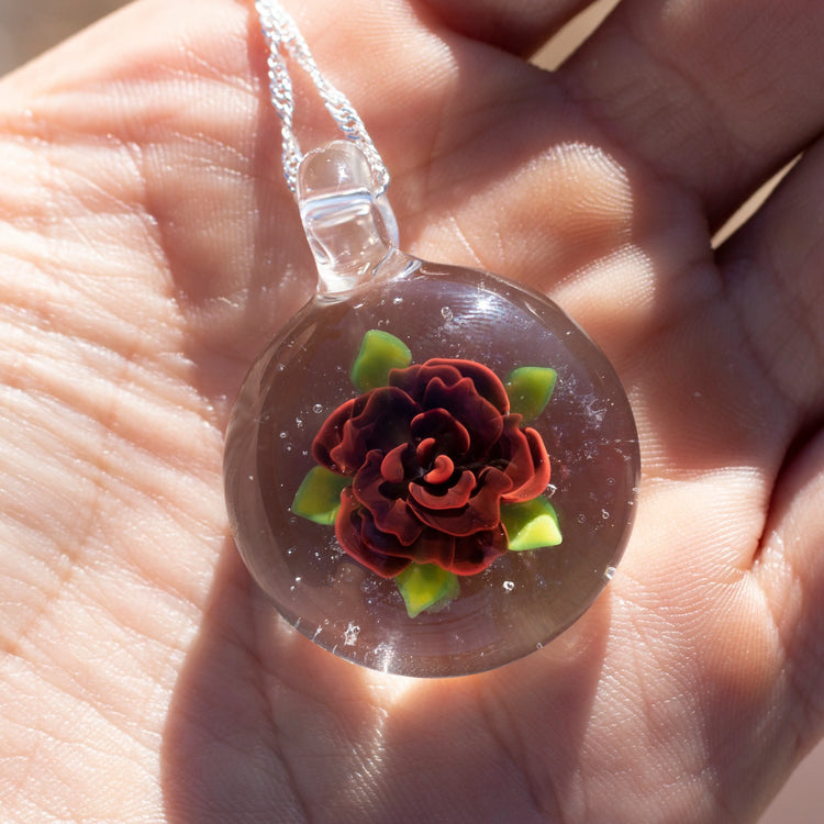 This eye-catching pendant is the perfect gift to yourself to honor the life of a lost loved one. The clear glass pendant features a beautiful red rose and a small amount of infused ashes. The pendant includes a silver-plated chain with two sizes to choose from.