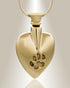 It is in the shape of a heart and crafted with gold plated stainless steel. It features an adorable pet paw imprint and comes with a complimentary twenty inch matching chain. Gold is sacred, robust, precious, and illuminating and is universally linked to the sun, making this pendant a fitting remembrance keepsake to honor the memory of your furry child.