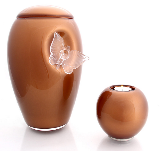 The Bohemian crystal butterfly urn is handmade and features a rich, coppery burnt orange hue. Each item is a masterpiece on its own with a stunning crystalized effect that resembles hundreds of tiny diamonds. A skilled artisan hand-blows the item before adding decorative effects and submerging it into transparent liquid crystal. The urn is adorned with a beautiful clear glass butterfly to finish the look. The urn measures 29cm high, 18cm wide, and has a capacity of 3.4 liters. This item is a beautiful remembrance keepsake to celebrate the life of a departed soul and comes in four color choices.