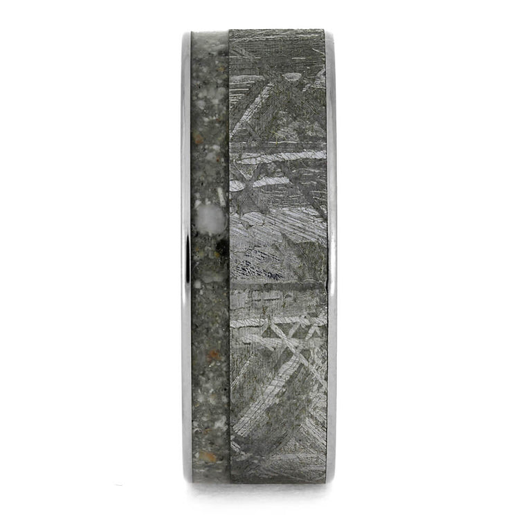 The Axel ring combines unique materials such genuine meteorite and polished titanium beautifully accent the ash inlay. which is delicately preserved in a protective coating.
