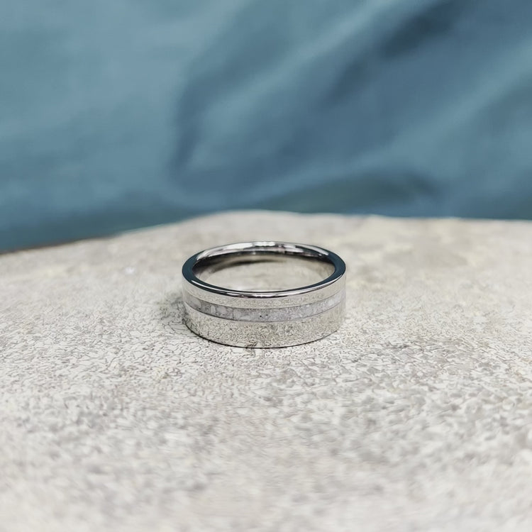 The ring's design is understated yet elegant, with a subtle off-set inlay of cremains that adds a personal touch.