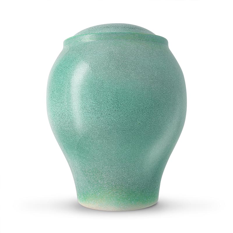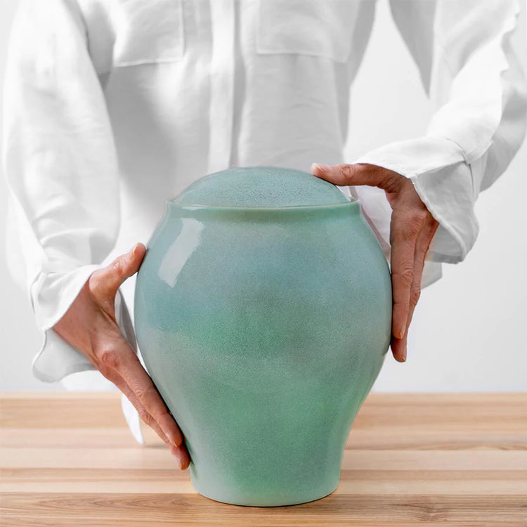 The ocean blue classic cremation urn features a graceful roundish shape with an understated teal shade across the circumference. The soothing blue shade of the urn echoes feelings of equanimity and peace and reminds us of a calm ocean. This urn is a beautiful keepsake to commemorate the memory of someone who had a love for the sea. These urns are specially crafted with natural, eco-friendly materials and are made to withstand the elements. The lid is affixed within a slightly raised area on the top to give the urn an overall seamless look. The items are glazed twice to make it impact resistant and aesthetically pleasing.