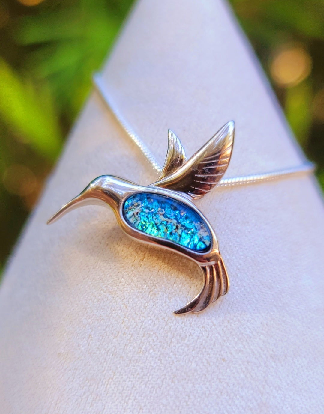 The carefully handcrafted pendant perfectly depicts the spirit of a hummingbird. The vivid blue color in this necklace’s centerpiece is represents joy and the fleeting beauty of life.