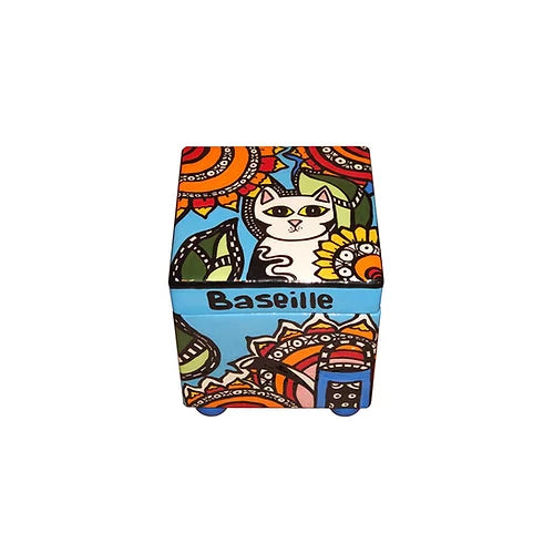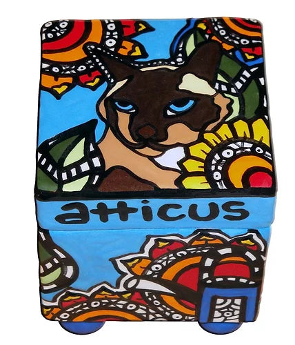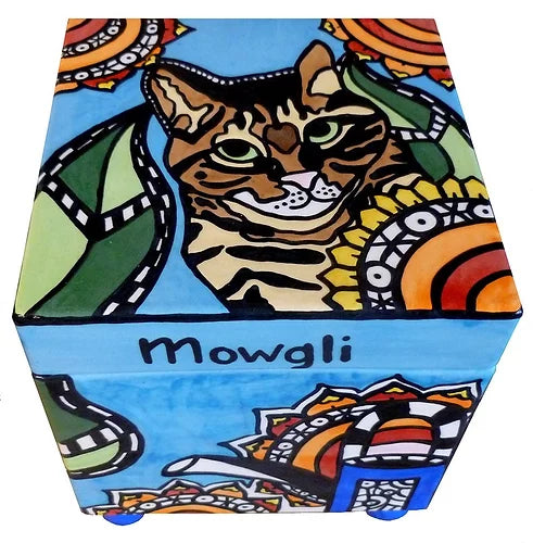 This box urn offers an endearing and colorful way to remember your cat who has passed on. It features personalised details of your cat and is handmade as well as signed by the artist. You have two size options with separate weight capacities to choose from.