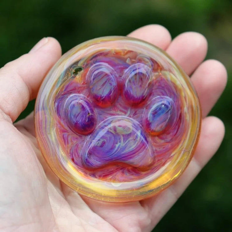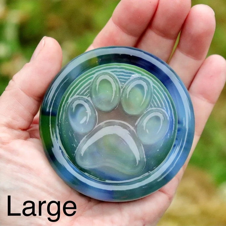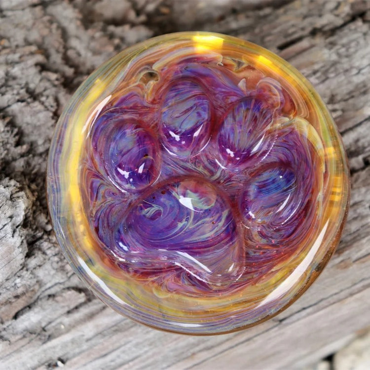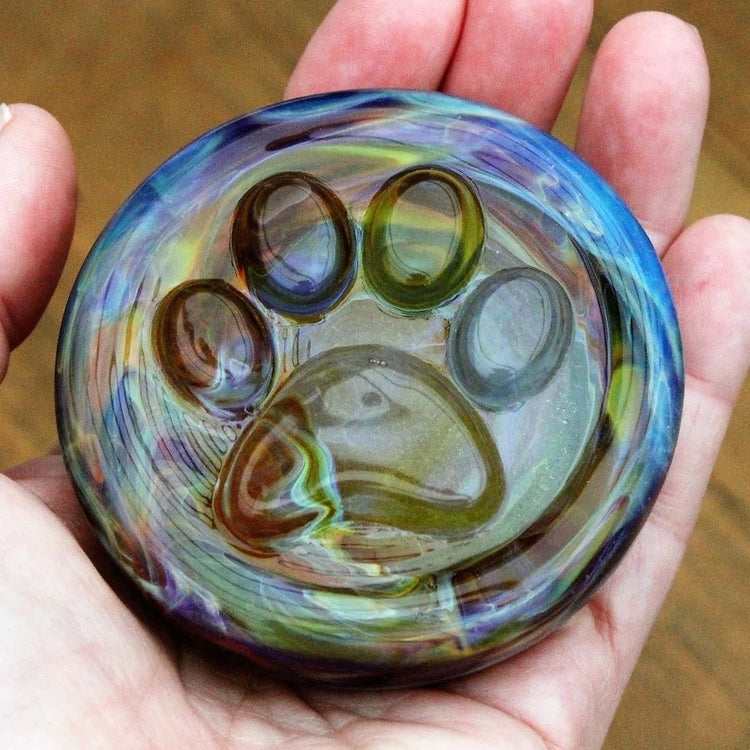 Show your devotion and love for a lost pet by investing in this beautiful paperweight with paw print design. What makes this item truly special is that it contains a tiny bit of cremains of your pet. The paperweight is made with durable Pyrex glass and comes in various colors. The crystalized ash-infused swirl makes this item the perfect keepsake.