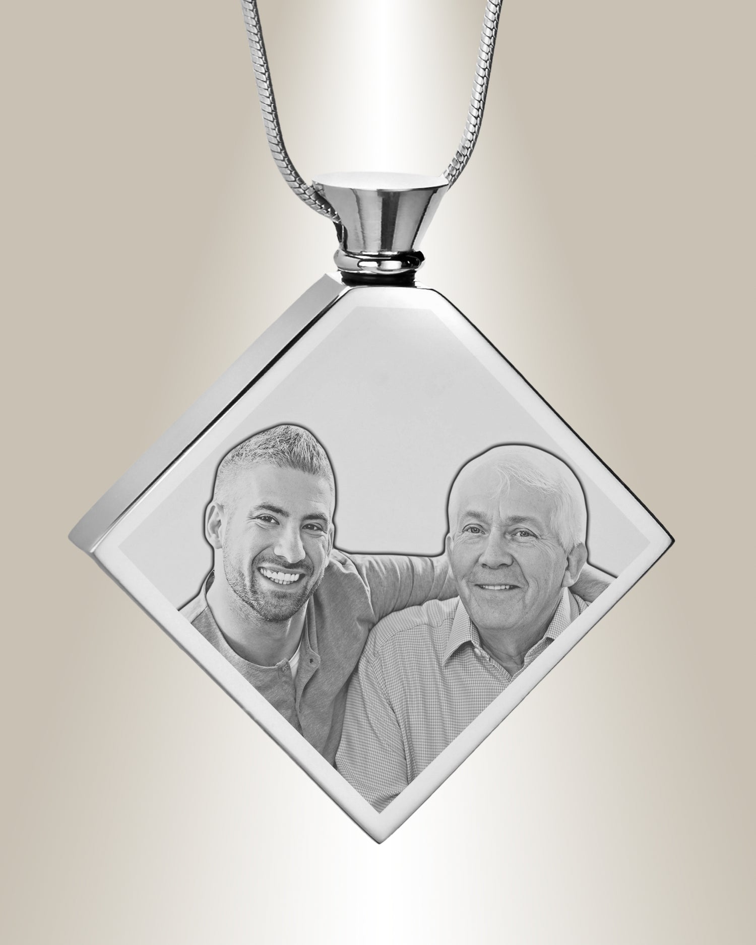 This exquisite diamond shaped pendant offers two ways to commemorate a loved one’s passing. You can add a photograph to the front face, cropped to meet your specifications. Additionally, a tiny bit of ash or a few strands of hair can be added inside the jewelry. The pendant arrives in a lovely gift box for safekeeping.