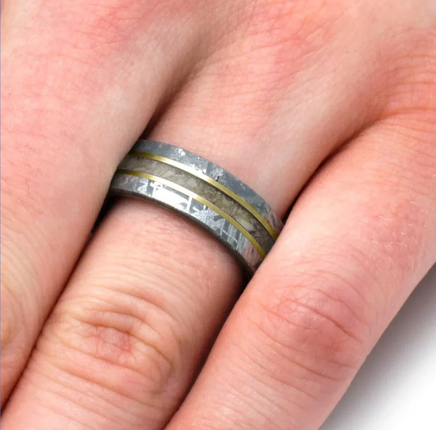 Expertly crafted from titanium and authentic Gibeon meteorite, with solid 14k yellow gold pinstripes add a touch of elegance to this pet cremation ring.