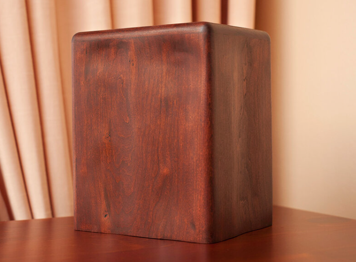 The Berkeley Urn Box is a splendid way to store the ashes of a family member or pet. The wood grain of the rustic cherry wood really shines through with the smooth corners and is further accentuated by the natural oil finish.