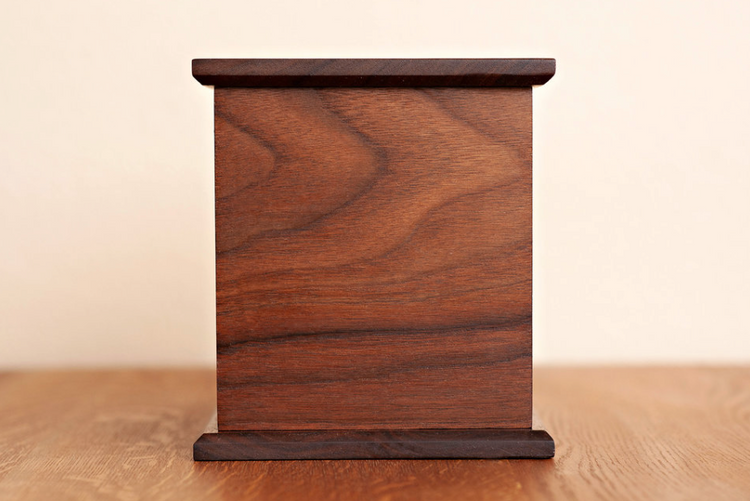 This Madison urn is handmade with authentic walnut wood and features an attractive 45 degree chambered edge on the bottom and top. It is handcrafted from walnut trees that are sourced from the Northwoods in Wisconsin. Walnut is commonly used for carpentry and expensive wooden items due to its resilience, robustness, and resilience to warping.