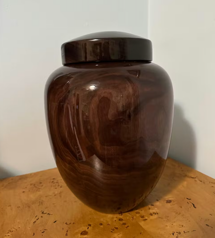 This extraordinary hand turned pure walnut wooden urn offers a lovely container for storing the memory of your loved one.