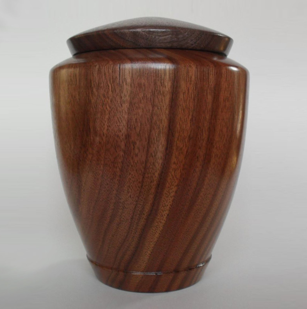 This striking handmade wooden urn offers a truly exceptional keepsake for holding your loved one's memory. Each urn is one of a kind because of the distinctive characteristics and woodgrain markings of the walnut wood used by the artist.