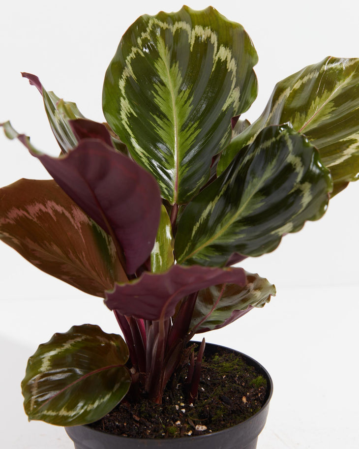 The Peacock Plant, or Calathea Medallion Roseopicta, is a Brazilian gem that brings the vibrancy of the rainforest into your home. Known for its unique "prayer plant" behavior, it raises and lowers its leaves daily, mimicking the act of worship. Its foliage is a spectacle of color, with watermelon hues of dark red beneath and variegated greens and yellows above, making it a standout addition to any indoor garden. Thriving in humid environments, this plant demands attention and care but rewards with stunning visual appeal.