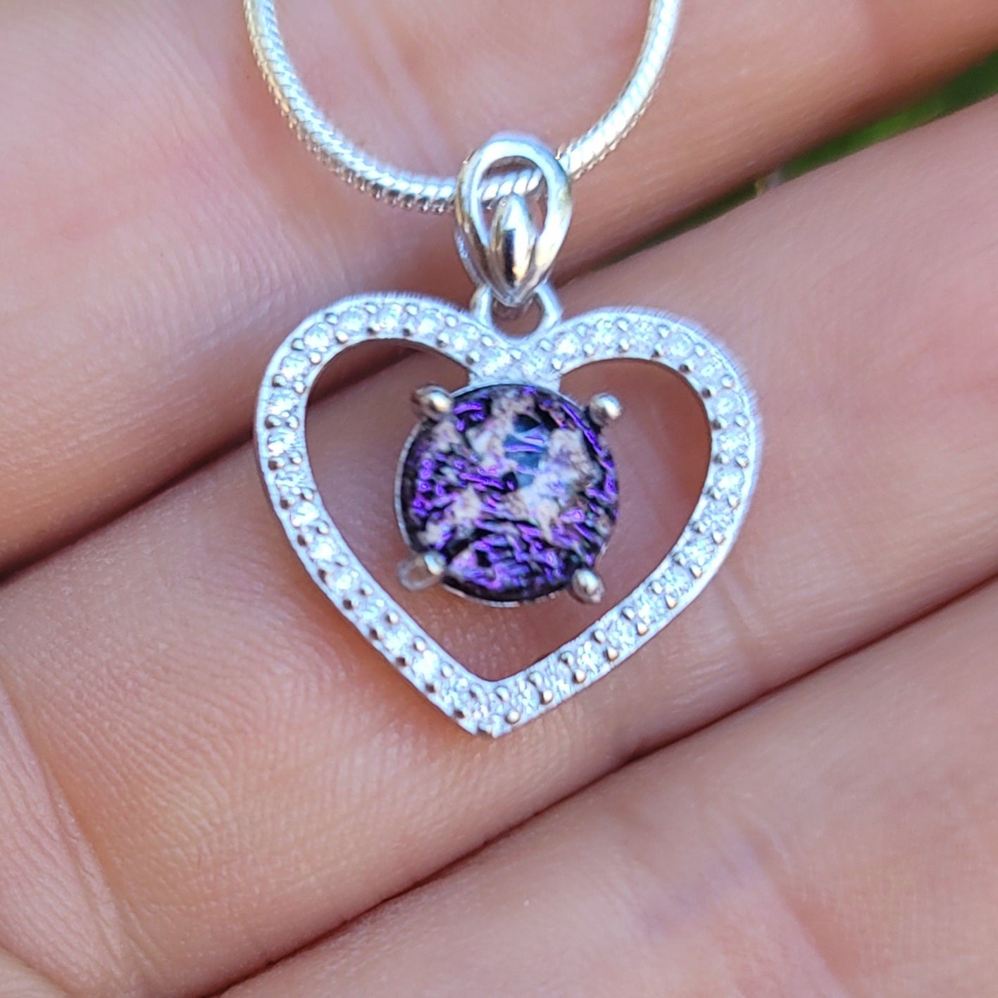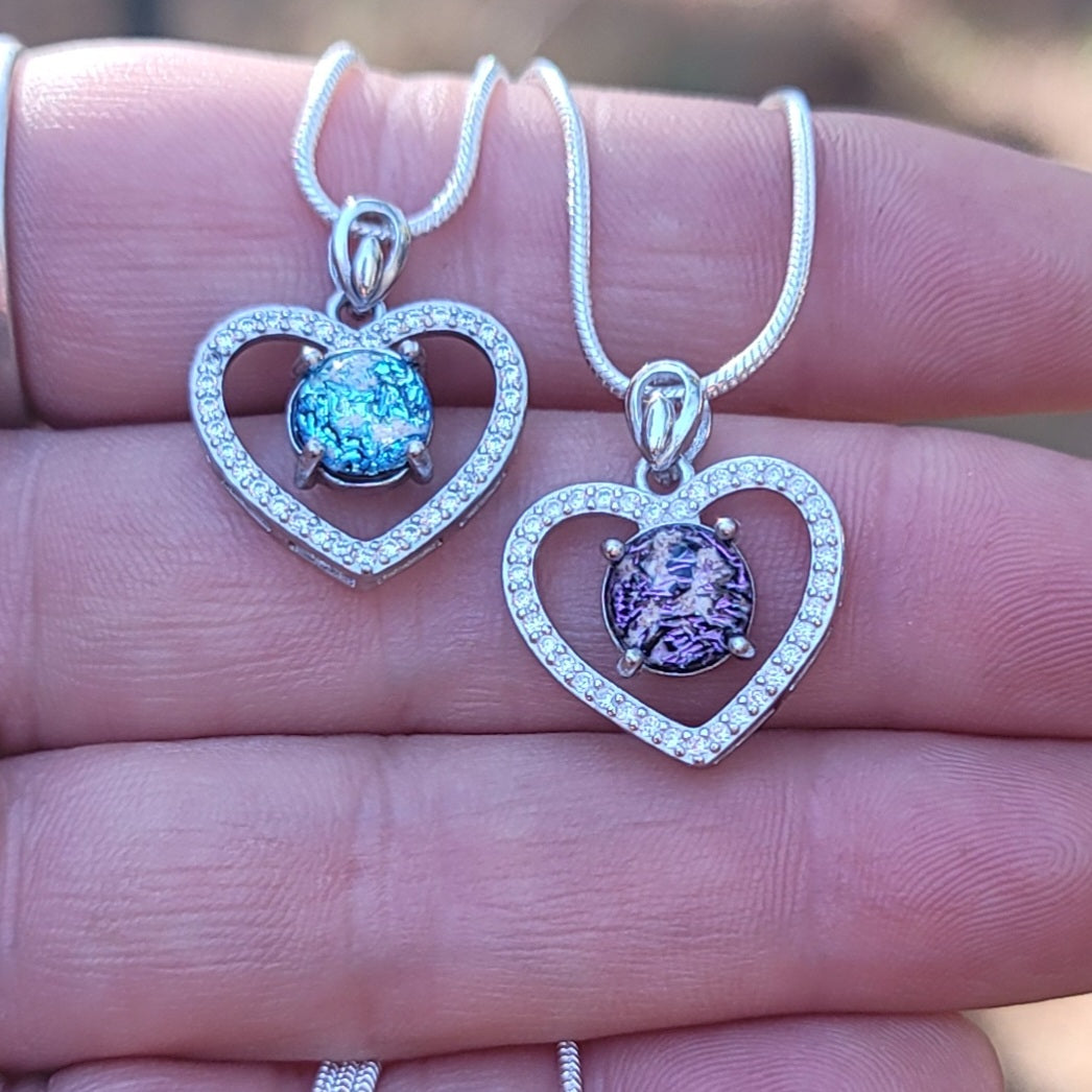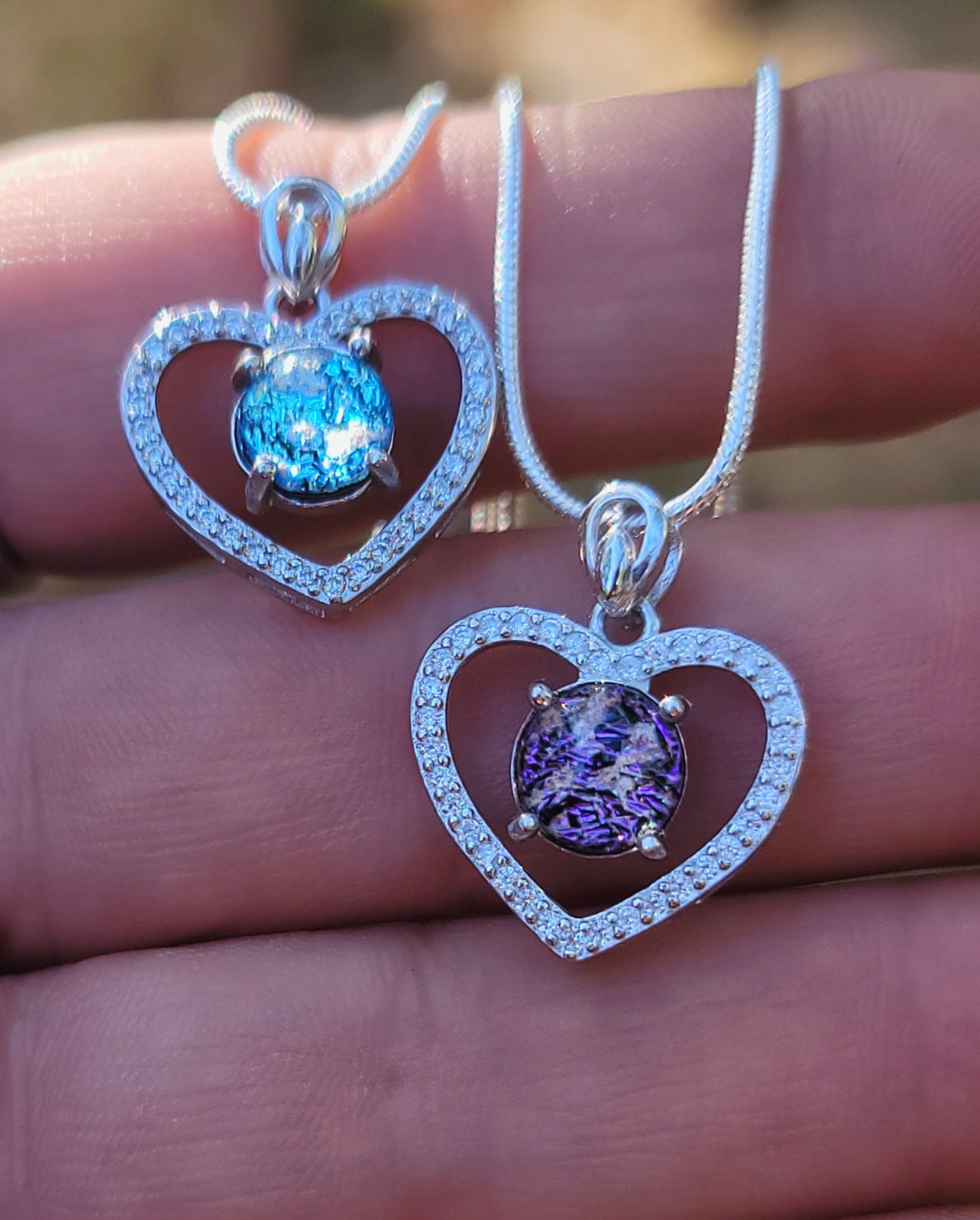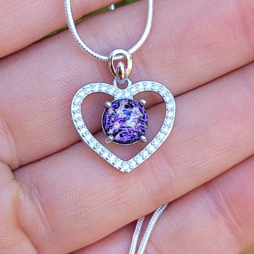 This heart-shaped necklace, features a stylish glass stone in the middle of it, which is infused with your loved one's ashes. Creative and unique, this a beautiful piece of sterling silver memorial jewelry.