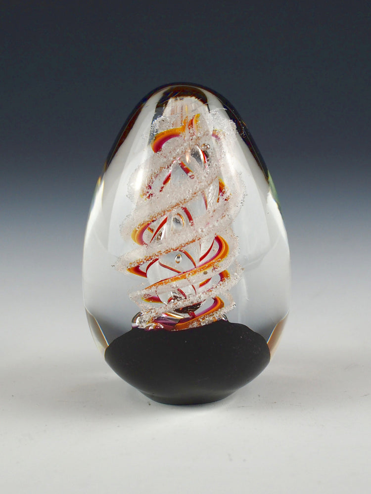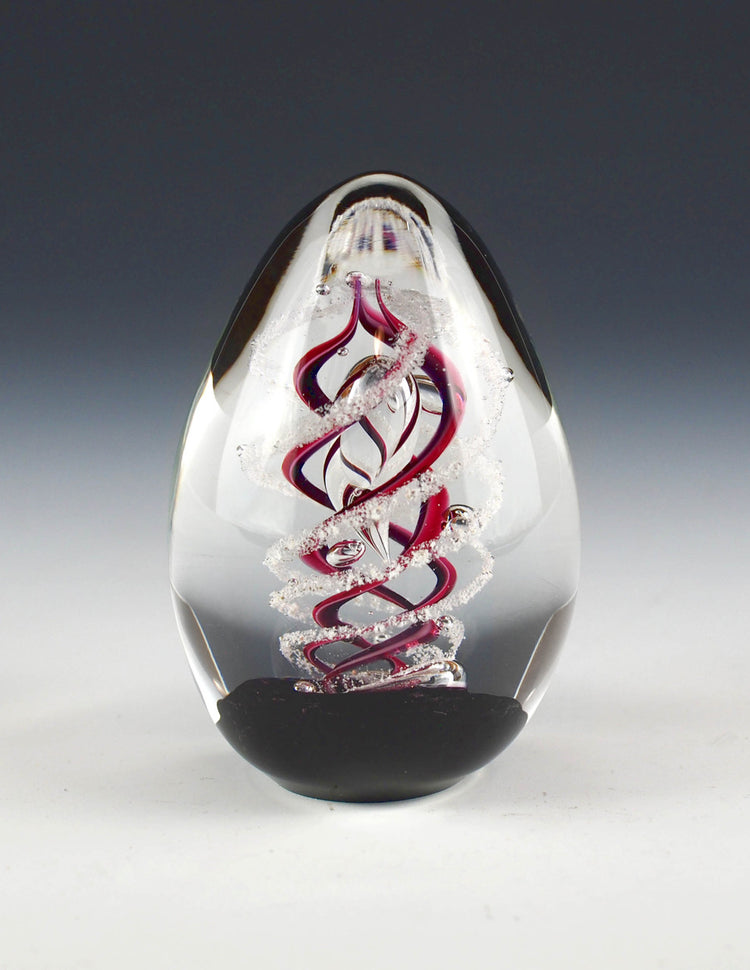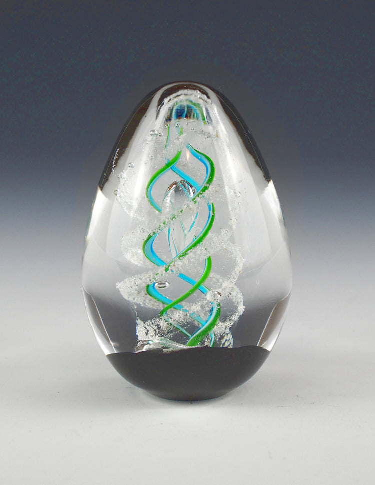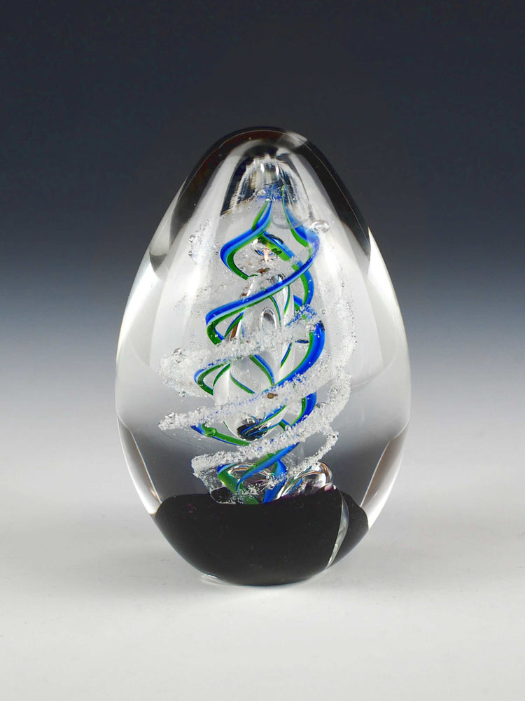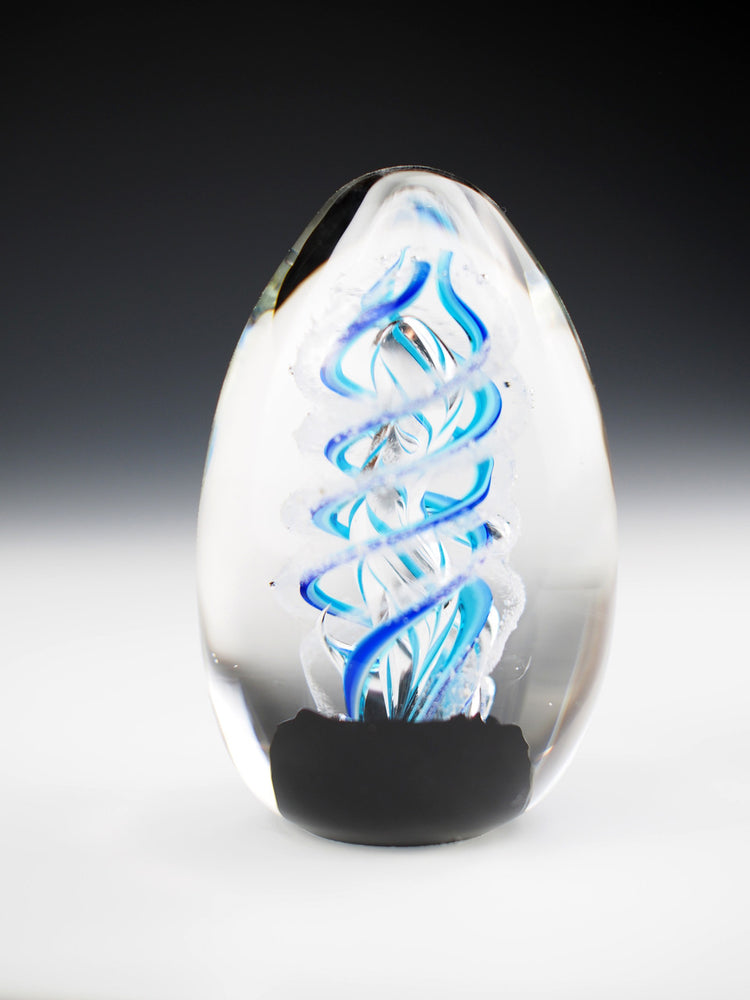 The Luna Memorial Paperweight features your loved one's ashes in a spiral pattern, all encased in a clear glass oval. Standing at approximately 2.5" in height, it requires only a 1/4 teaspoon of ash.