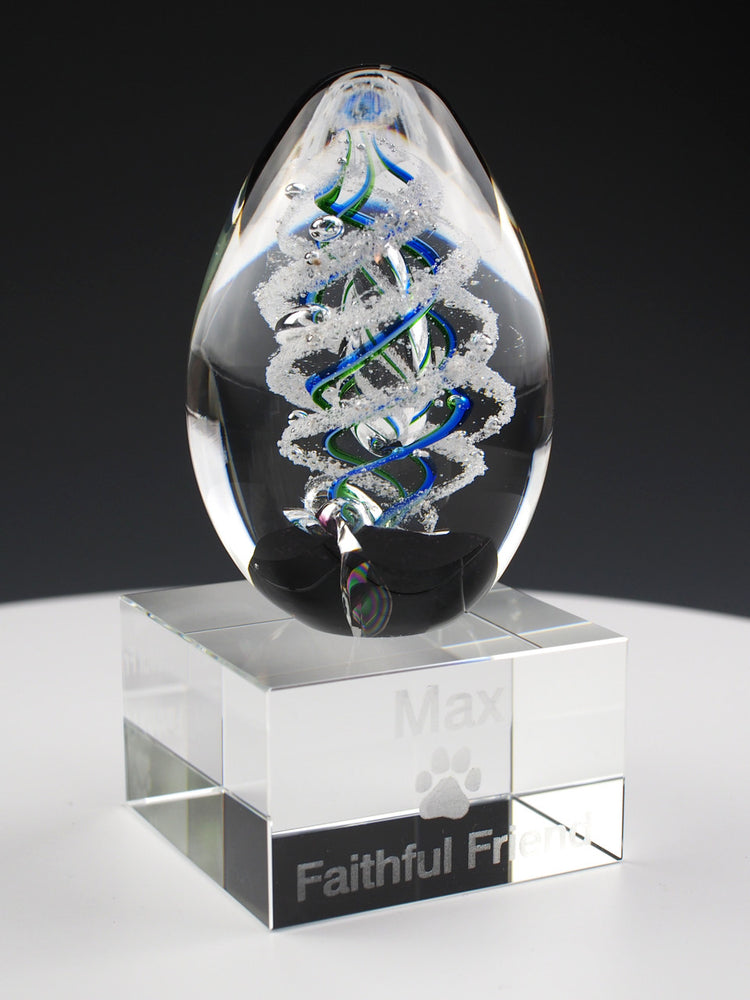 Crafted from molten glass, this memorial captures the complexities of life and relationships, adding depth to any space. Optional engraved bases and handwritten inscriptions offer a personalized touch.