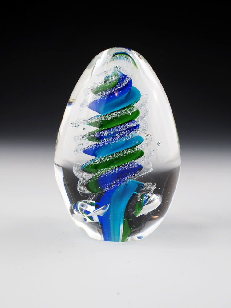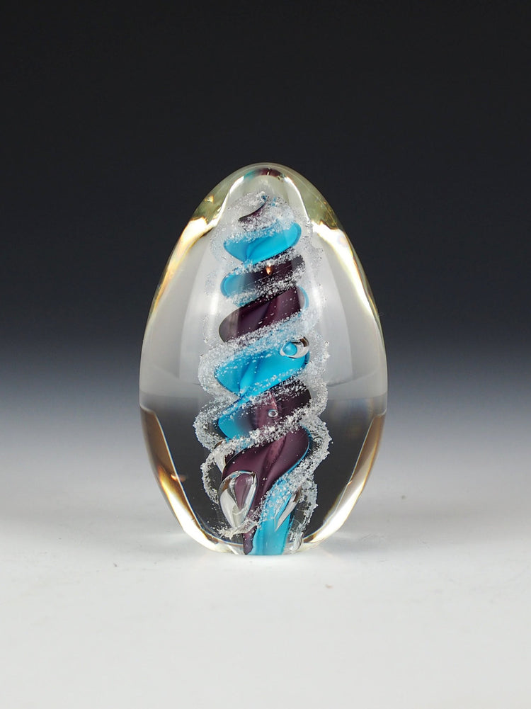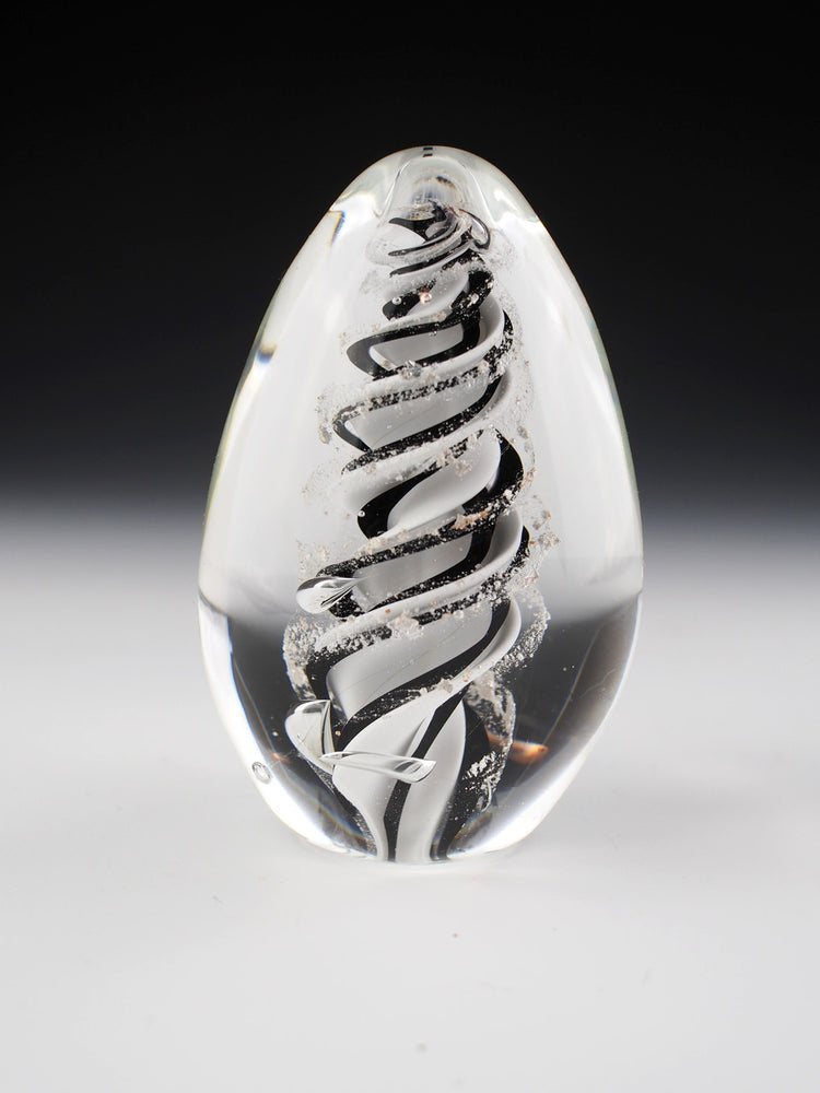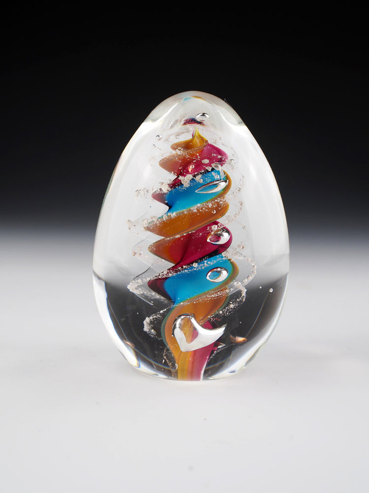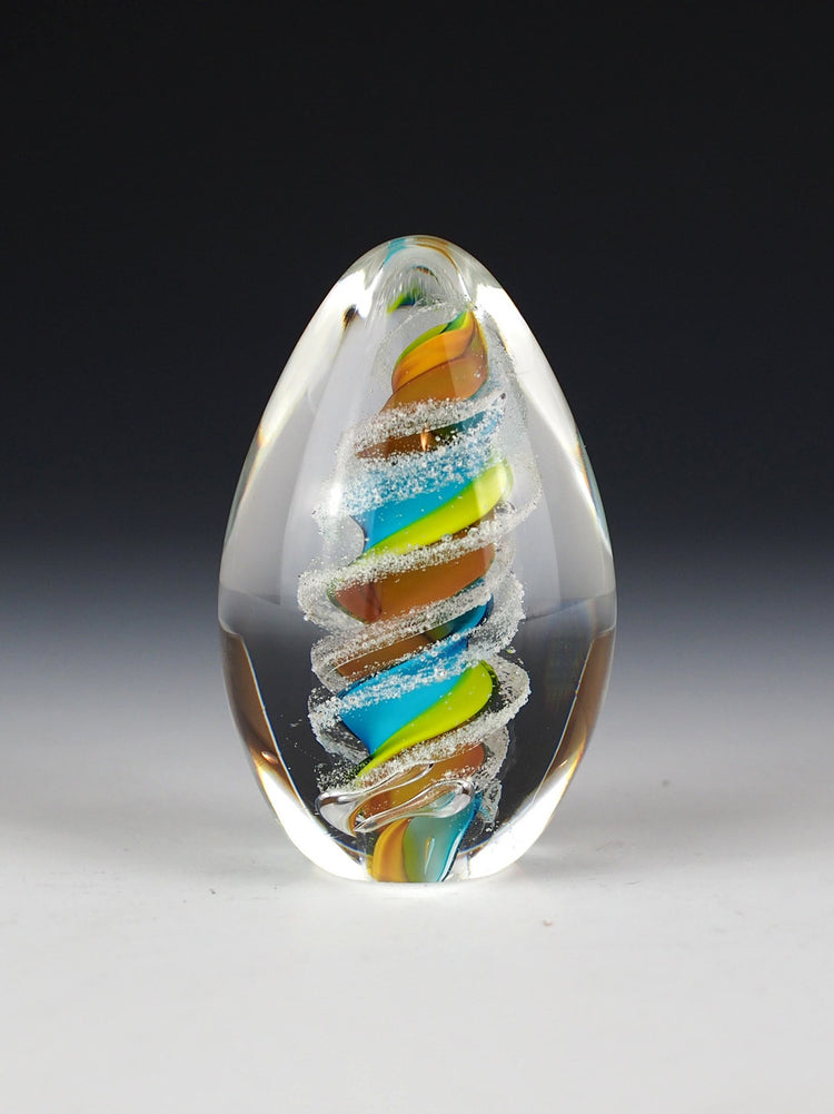 The Tranquil Oval Multi-Color Memorial Paperweight features a vibrant center swirl with a spiral of cremains, all encased in a clear glass oval. Standing at approximately 2.5" in height, it requires only a 1/4 teaspoon of ash.