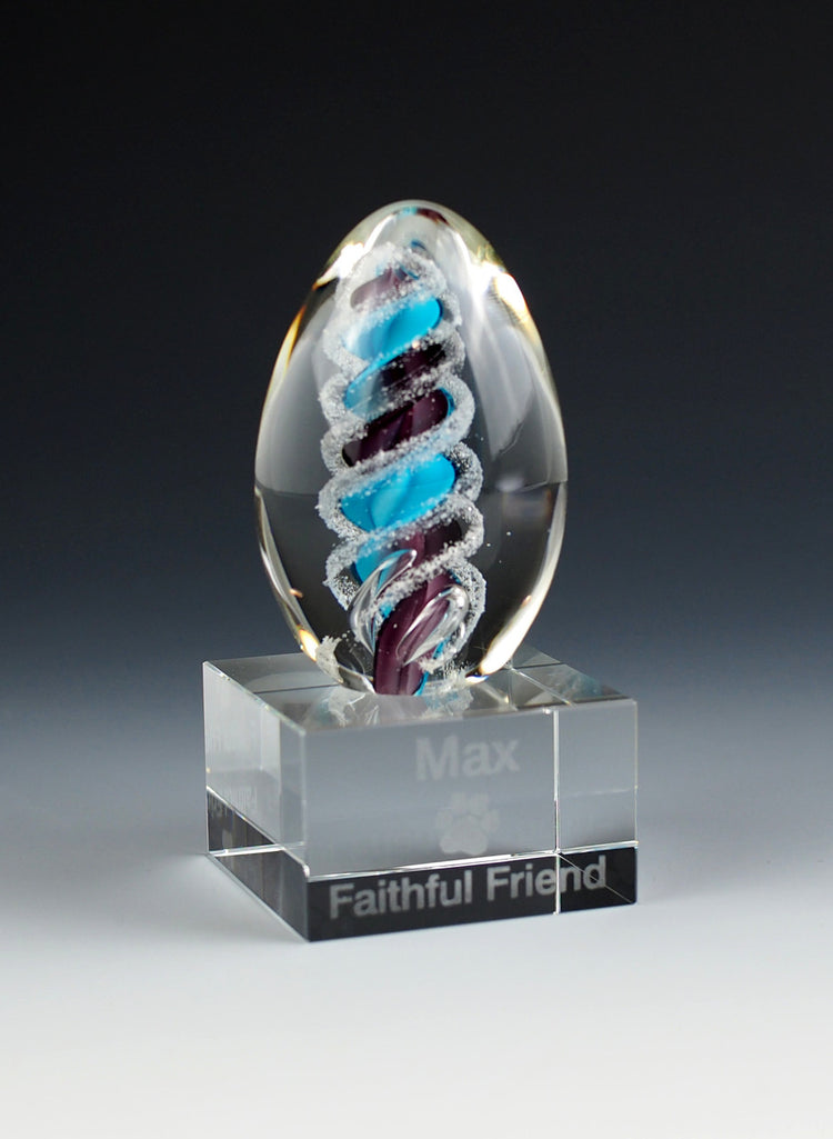 Crafted from molten glass, this memorial adds a pop of color and a sense of serenity to your surroundings. Optional engraved bases and handwritten inscriptions offer a personal touch.