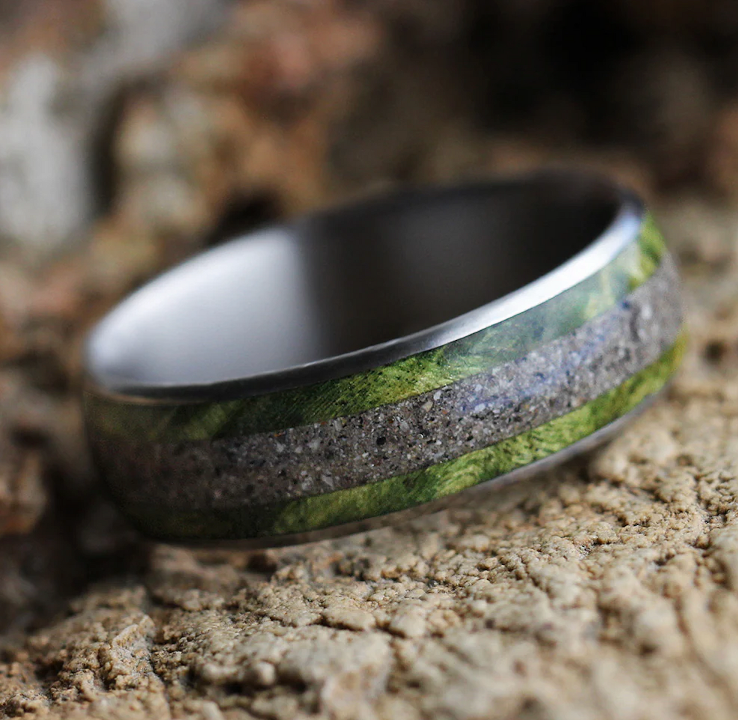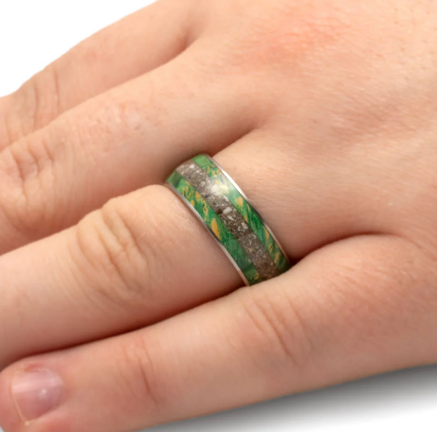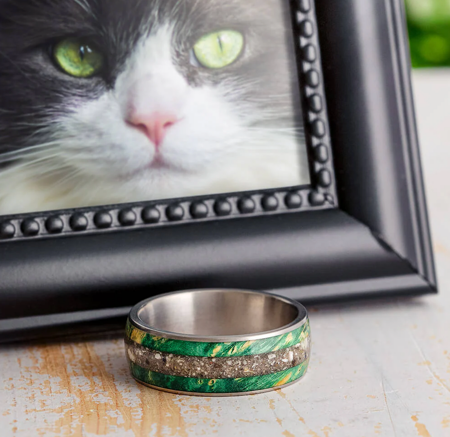 The Ivy Pet Memorial Ring is a heartfelt tribute to your beloved pet. Crafted from durable titanium, this ring features an inlay of green Box Elder Burl wood, symbolizing renewal.