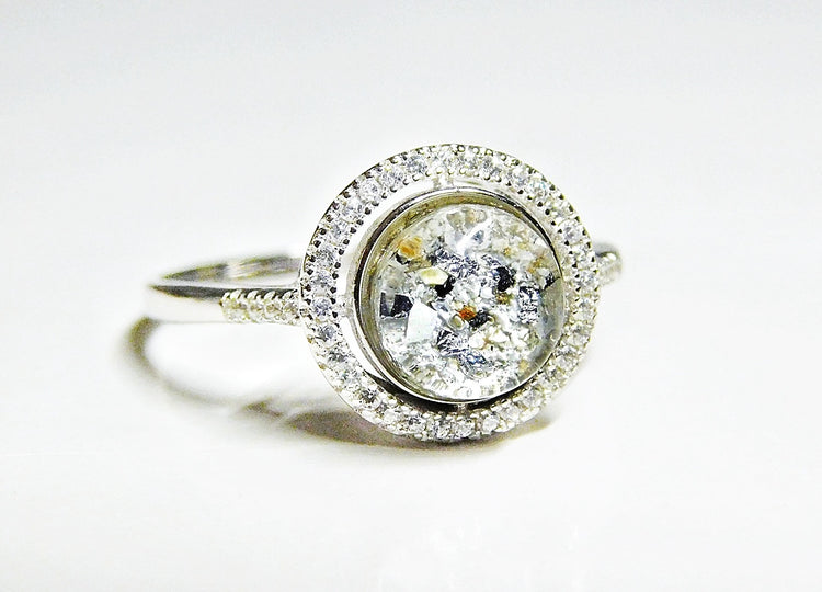 With its 8mm cremation glass stone surrounded by a halo of dazzling diamonds, this ring represents their remarkable presence and the eternal sparkle.