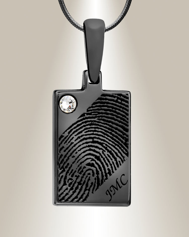 This keepsake jewelry piece offers a unique look with its black plated .925 sterling silver pendant. The front face is laser engravable with a fingerprint of yourself or someone you care about. Another special effect is a tiny rhinestone in the left top corner, as well as three initials engraved on the bottom right. You can show off this one-of-a-kind pendant around your neck with the matching twenty inch chain.