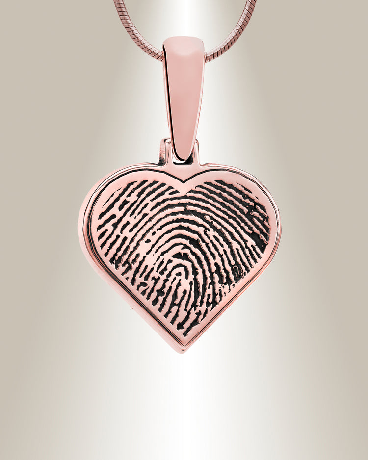 Show your devotion and love for someone you care about with this beautiful heart pendant. The pendant is crafted with rose gold plated sterling silver. Engraving with fingerprints can be done on both halves of the heart for a one-of-a-kind appearance. The pendant comes with a matching twenty inch chain. You have the option to add text engraving on the back of the pendant.