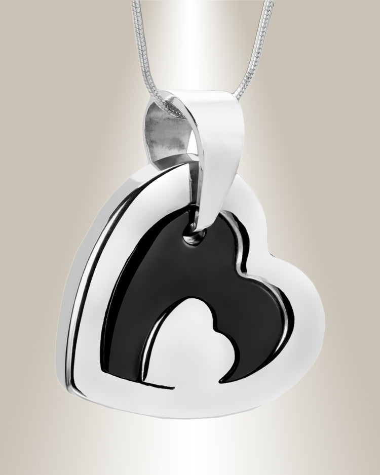 The pure heart cremation pendant is an elegant and aesthetically beautiful jewelry piece to commemorate the life of someone who has passed on. The item features a tiny heart resting inside a bigger black heart. The stainless steel structure ensures robustness and longevity, perfect for everyday wear. Each pendant is specially crafted with a small chamber for storing human cremains. Show your adoration and affection for the deceased with this striking remembrance jewelry piece.