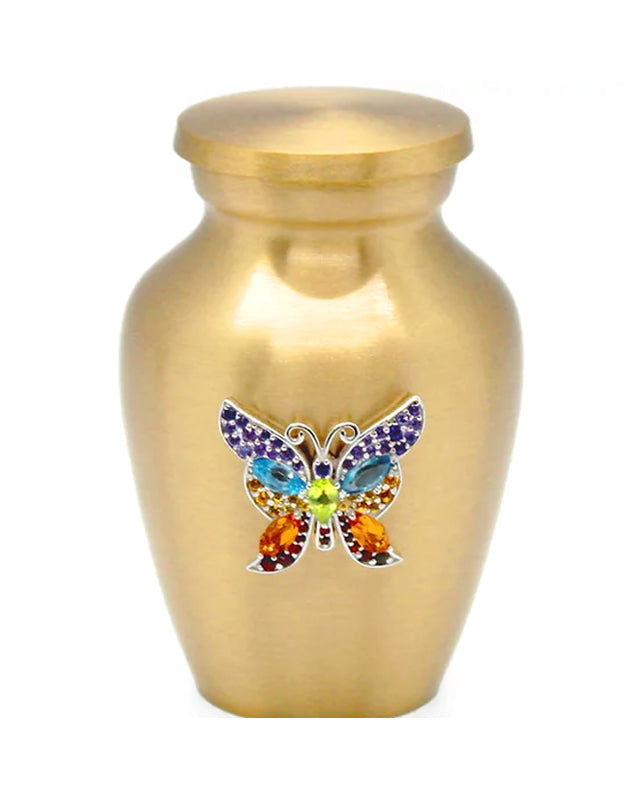 This diamond urn is exquisite with its golden exterior and colourful crystal butterfly centrepiece. Butterflies signify the metamorphosis from a colorless, common caterpillar into a stunning and delicate butterfly. It is a metaphor for hope and transformation, leaving our earthly existence behind and entering the world of the divine. That is why this urn is an excellent keepsake to celebrate the life of a loved one who has passed on. Each piece is handmade with three size options to choose from. The crystals can be upgraded to diamonds upon your request.