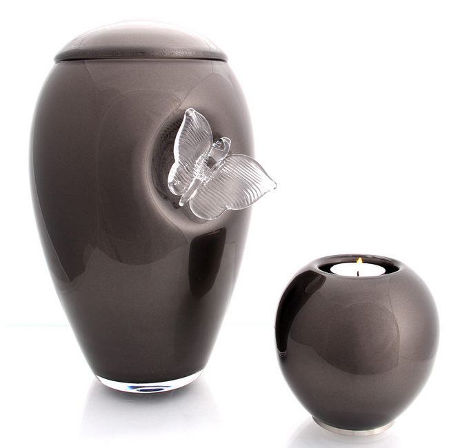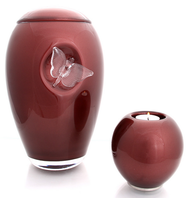 The Bohemian crystal butterfly urn is handmade and features a rich, coppery burnt orange hue. Each item is a masterpiece on its own with a stunning crystalized effect that resembles hundreds of tiny diamonds. A skilled artisan hand-blows the item before adding decorative effects and submerging it into transparent liquid crystal. The urn is adorned with a beautiful clear glass butterfly to finish the look. The urn measures 29cm high, 18cm wide, and has a capacity of 3.4 liters. This item is a beautiful remembrance keepsake to celebrate the life of a departed soul and comes in four color choices.