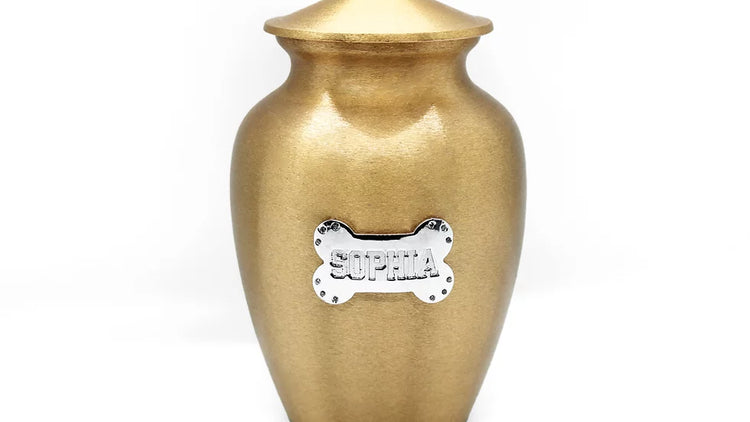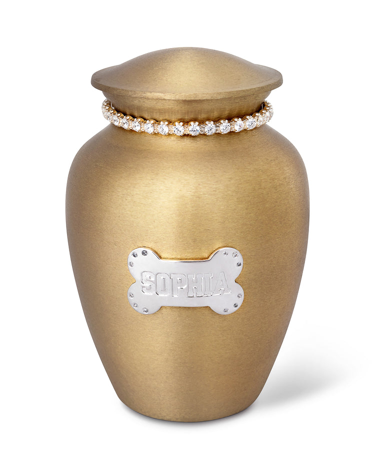 This stunning urn features a golden exterior with a crystal dog bone embellishment. This piece is handcrafted and offers an excellent keepsake to honor the memory of a beloved family pet who has passed away. The urn is made from only the best crystals and metals and is available in three size options. You also have customisable options that include upgrading to diamonds, and adding a crystal or diamond necklace.