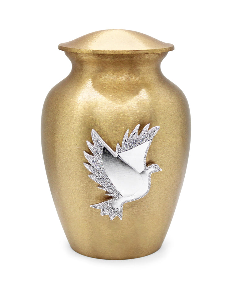This exquisite urn features a warm golden exterior with a striking crystal dove embellishment. Doves are present in the symbolism of various religious groups and are viewed as a symbol of freedom, peace, and love. Each urn is hand crafted by skilled artisans to give you something tangible to celebrate the memory of someone that has passed on. The urn has customisable options that include an upgrade to diamonds and/or adding a crystal necklace. The large sized urn comes with two dove ornaments.