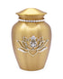 Show your love and appreciation for someone you’ve lost with this exquisite diamond urn that features a golden hue and Lotus flower crystal centrepiece and necklace. Perhaps the person had a great love for rare and delicate flowers. Each piece is made by hand, from scratch, by qualified artisans which means each piece is unique. Only the best quality silver, crystals, and brass are used, and you have three size options to choose from. The crystals for the flower can be upgraded to diamonds upon your request.