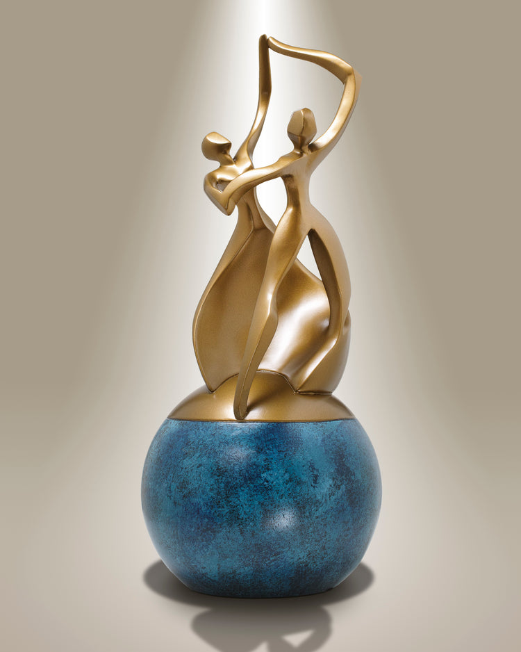 This blue and bronze urn is truly extraordinary with two dancing bronze figurines that adorns a striking blue rounded base. The urn symbolizes the life that we share with a partner through challenging and good times, joined as one. This urn is crafted by hand, bringing you a sole piece of art that is signature stamped and copyrighted. Show your everlasting love and devotion for a departed soul with this lovely memorial keepsake urn.