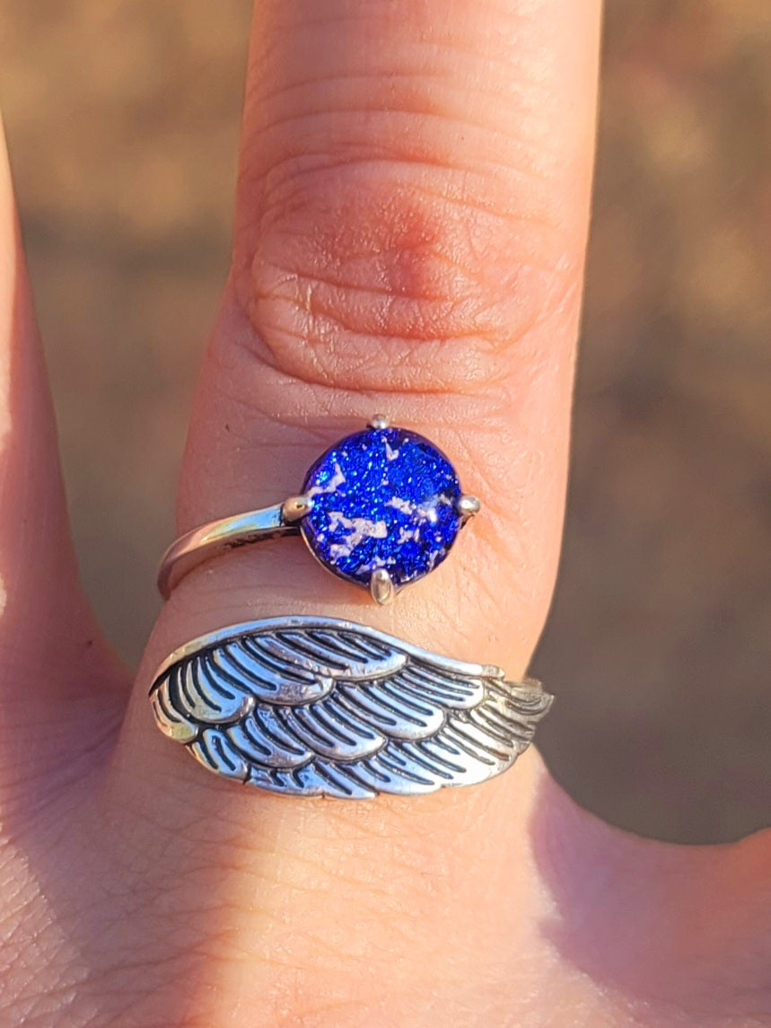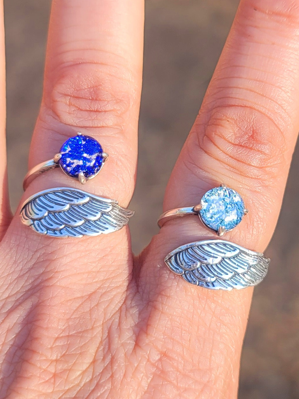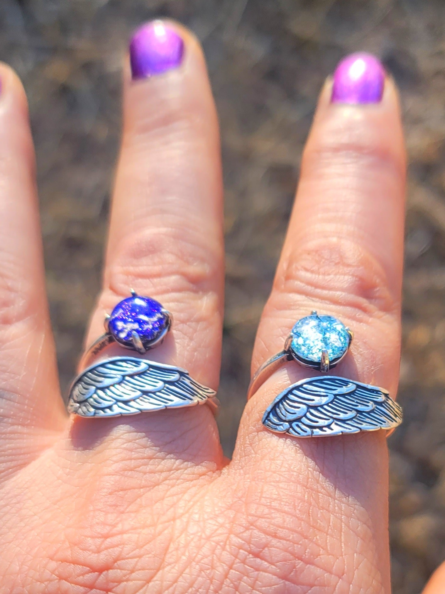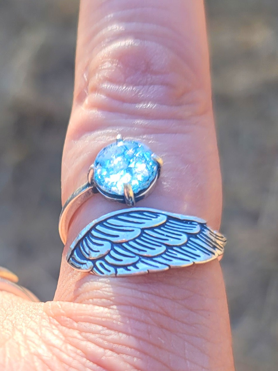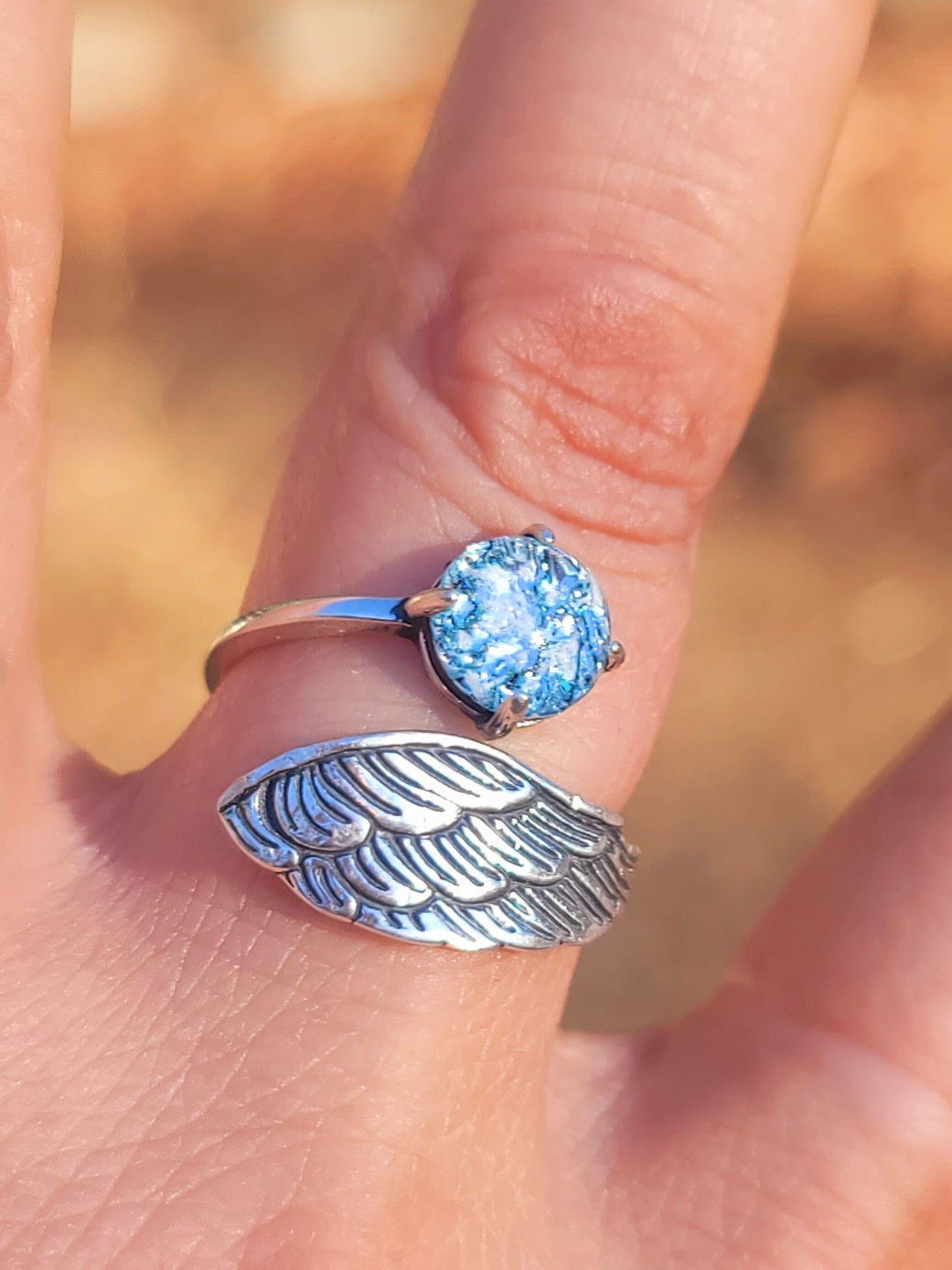 This sterling silver cremation ring features a delicate wing part that lovingly embraces your finger, symbolizing the eternal connection you share.