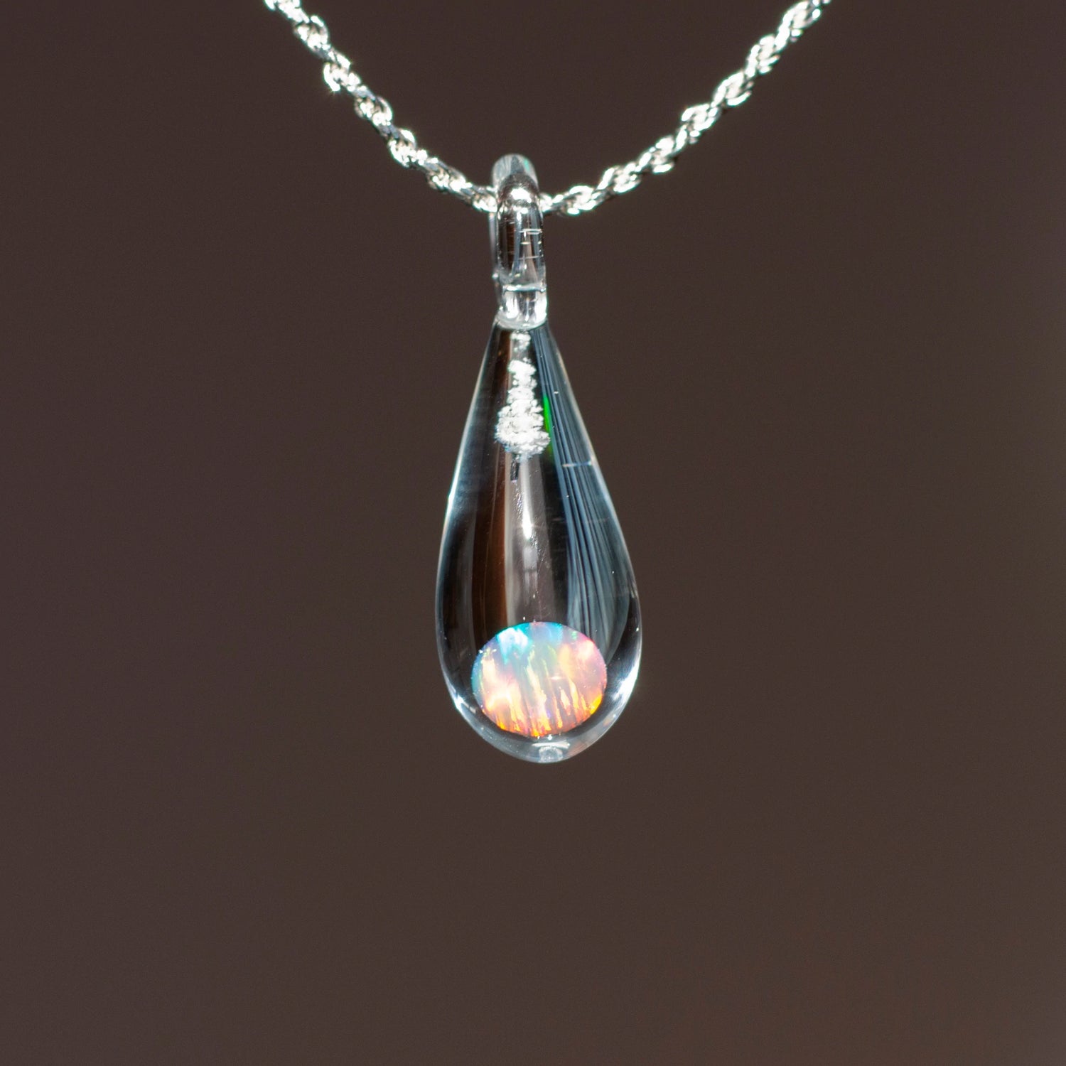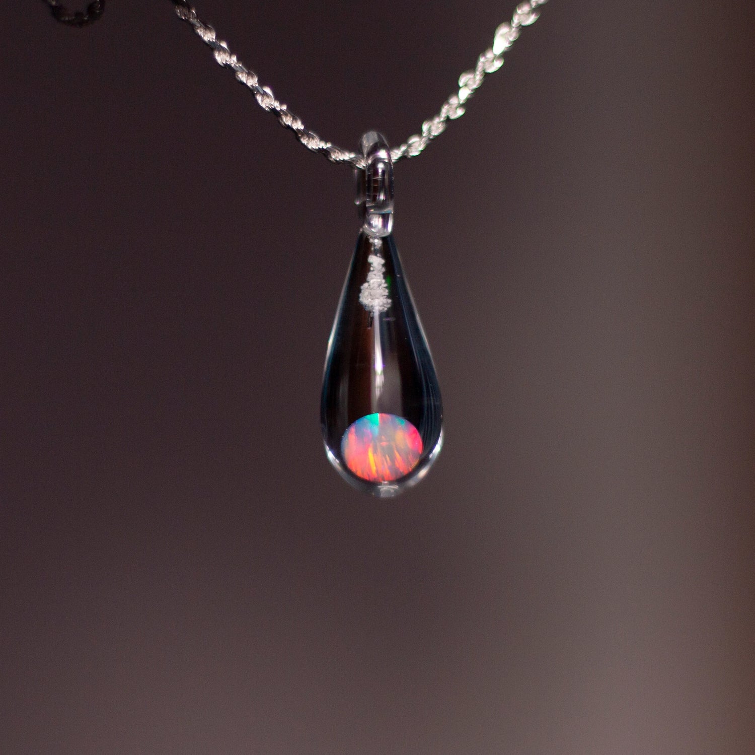 This gorgeous teardrop glass pendant has a striking opal that flashes different colors when held against the light. The photo doesn’t truly capture the beauty of this unique keepsake. A tiny bit of ashes is infused to celebrate the life of someone you’ve lost.