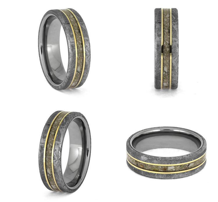 Expertly crafted from titanium and authentic Gibeon meteorite, with solid 14k yellow gold pinstripes add a touch of elegance to this pet cremation ring.