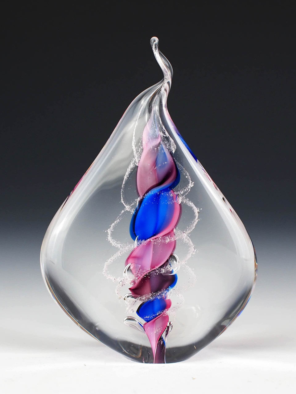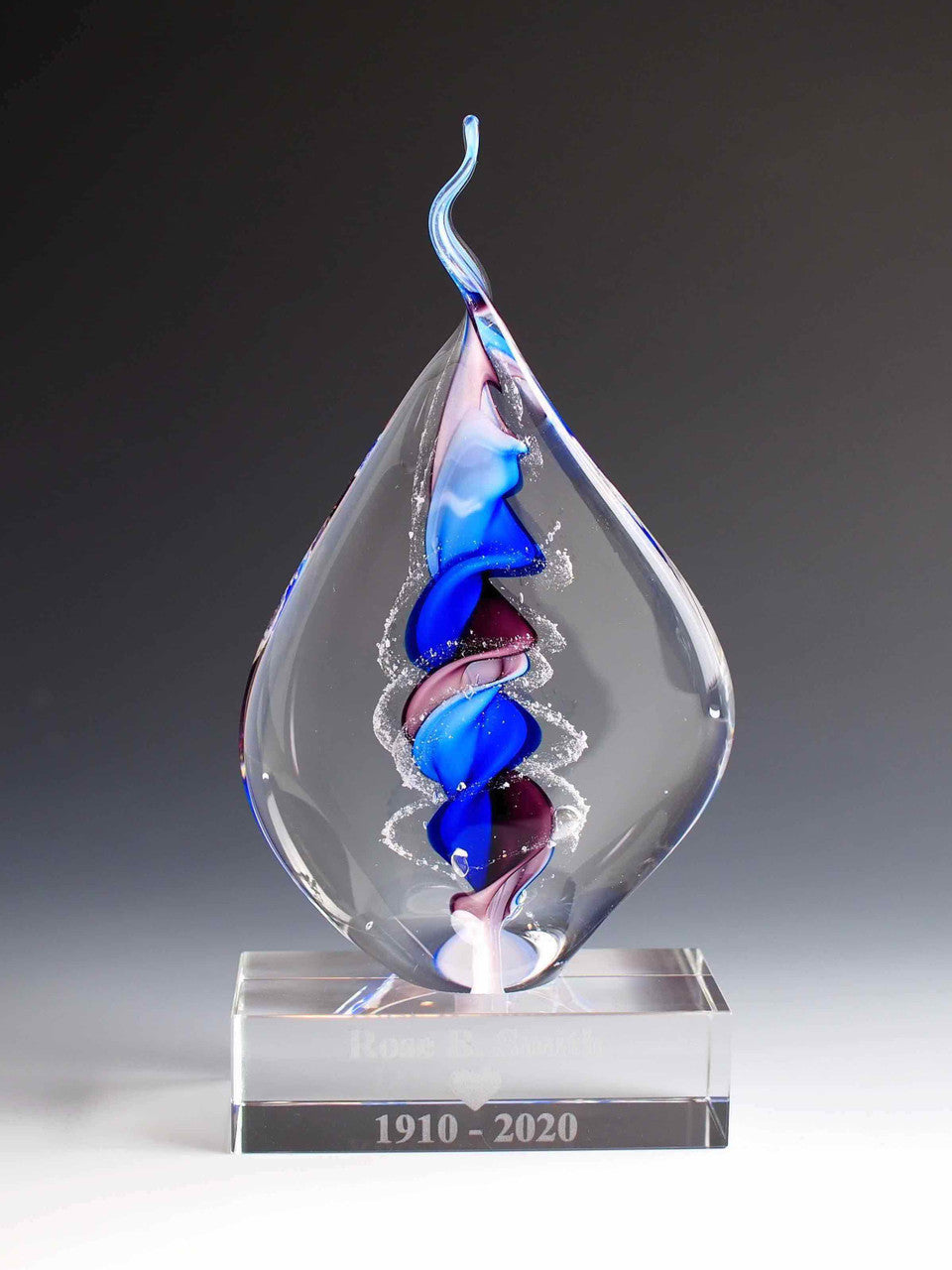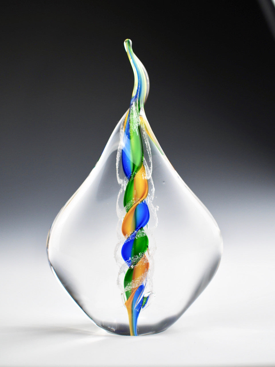 The Eternal Multicolor Flame offers a vibrant twist on our classic design, featuring a colorful core around which your loved one's ashes spiral. Made from both clear and colored molten glass, this memorial is a lasting and beautiful tribute.