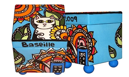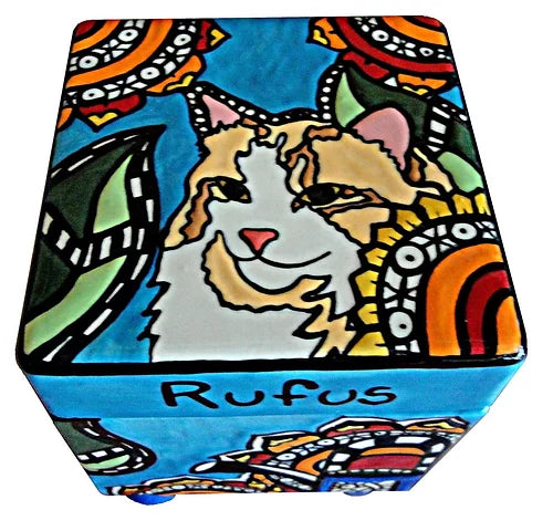 This box urn offers an endearing and colorful way to remember your cat who has passed on. It features personalised details of your cat and is handmade as well as signed by the artist. You have two size options with separate weight capacities to choose from.