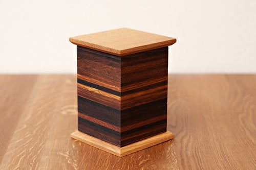 The urn handmade using reclaimed white oak wood and whiskey and wine barrels from local wineries and distilleries. Every piece of wood is carefully selected for its cut and color, before it is sanded and blended with other wooden plank pieces.